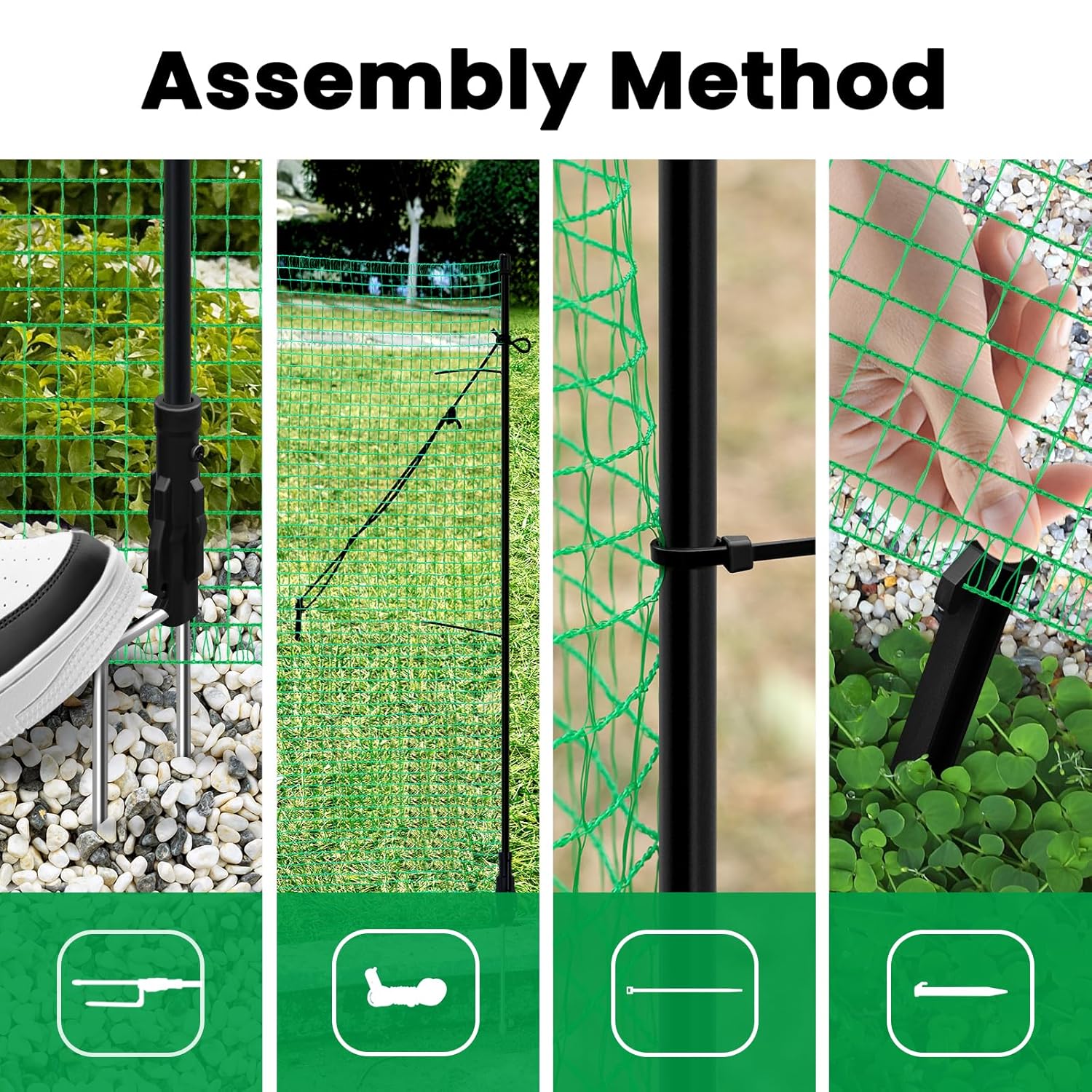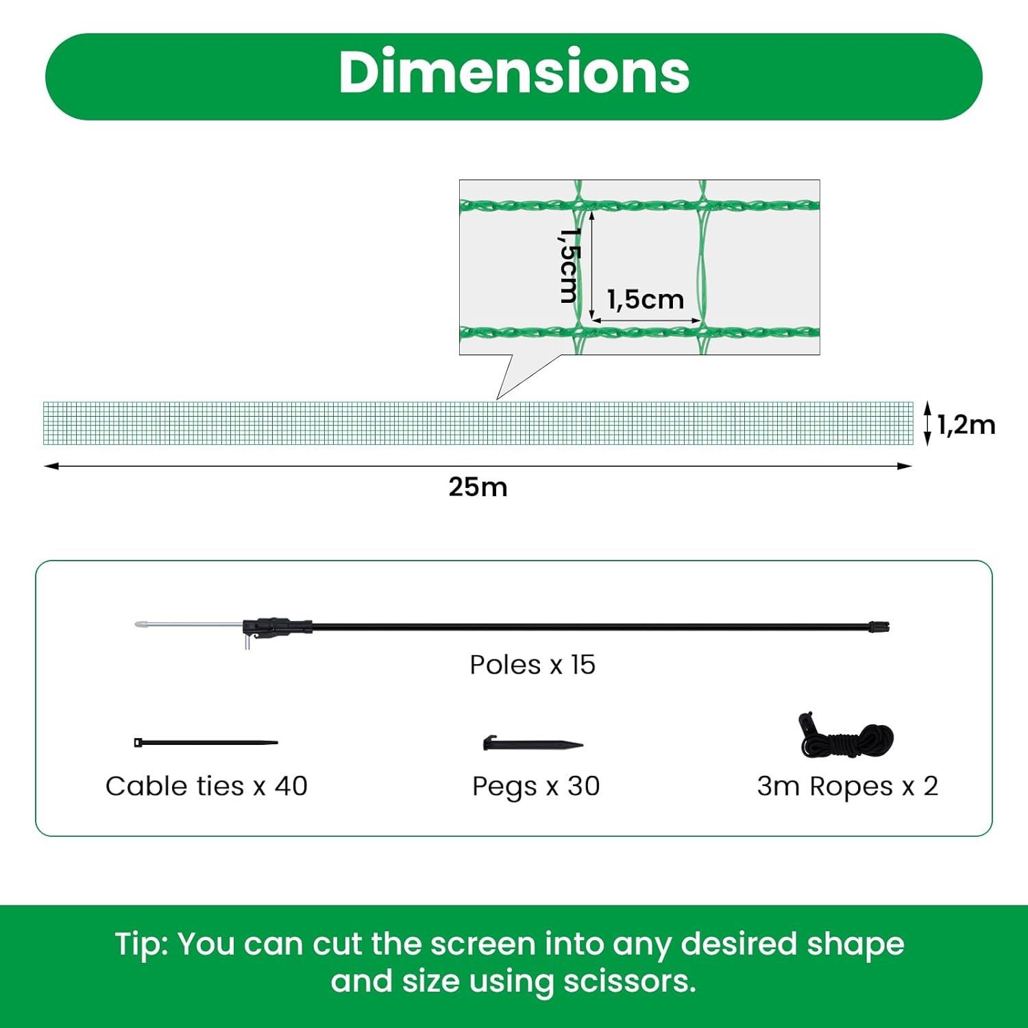 Lengvai pritaikomas: tinklą galima kirpti – jis neišsiardo. Komplekte yra 15 stiklo pluošto kuoliukų su metaliniais smaigais įtvirtinimui į žemę, 2 virvės, 30 tvirtinimo kuoliukų ir 40 kabelinių dirželių didesniam stabilumui.