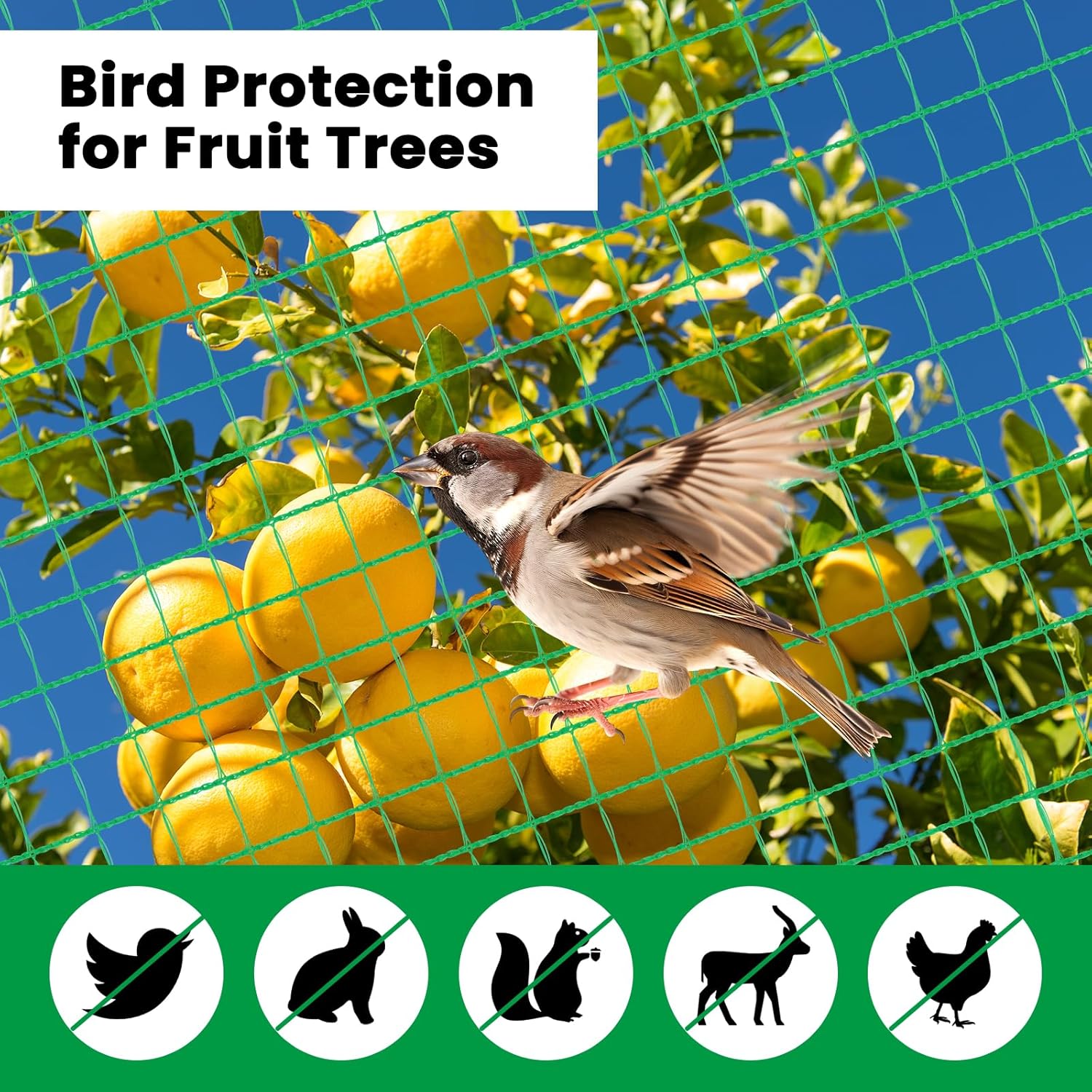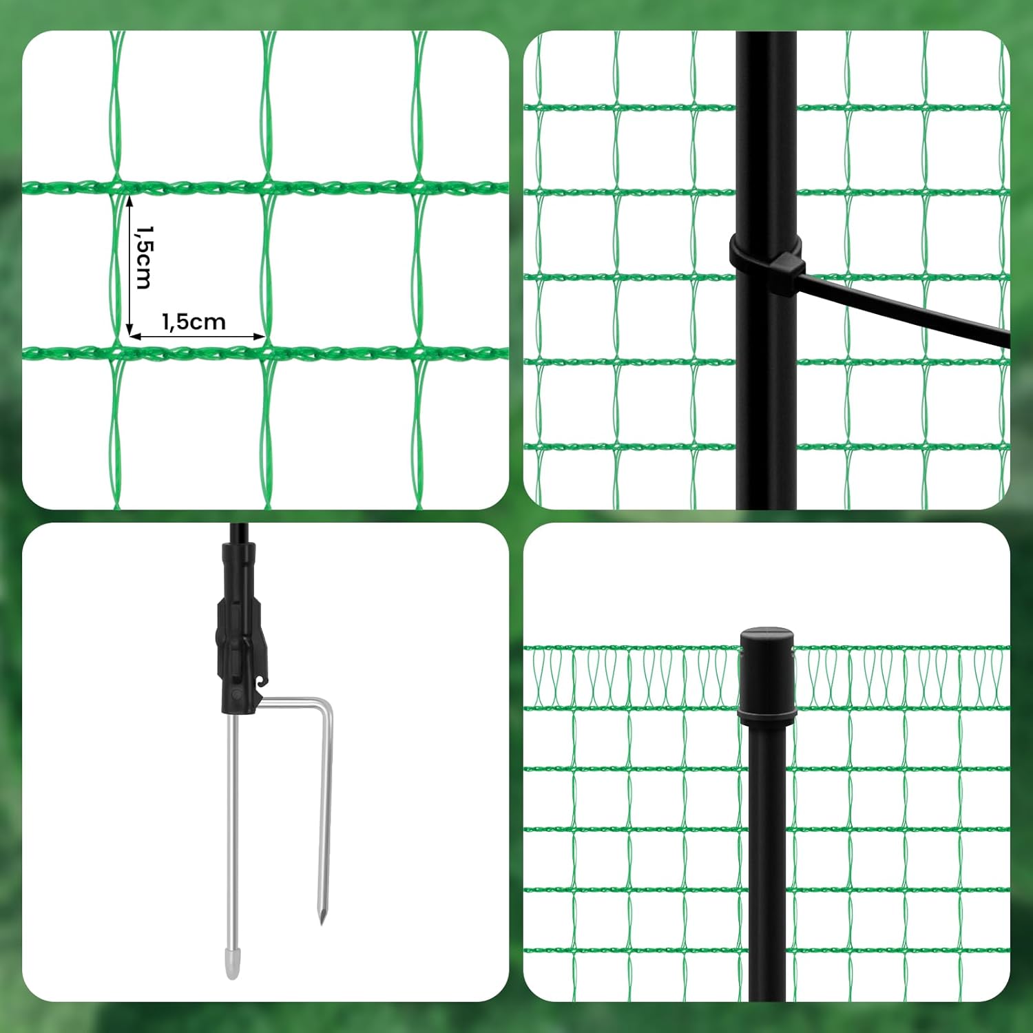 1,5 x 1,5 cm akutės: sodo tvorelė apsaugo augalus nuo paukščių, voverių ir kitų gyvūnų jų neįstrigdama. Tinklas neužstoja saulės šviesos ir vandens, todėl netrukdo augalų augimui.