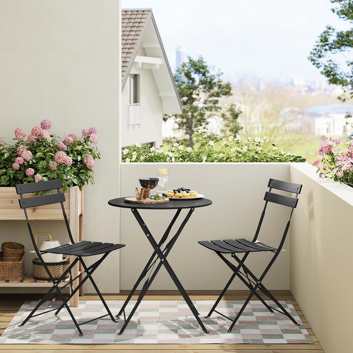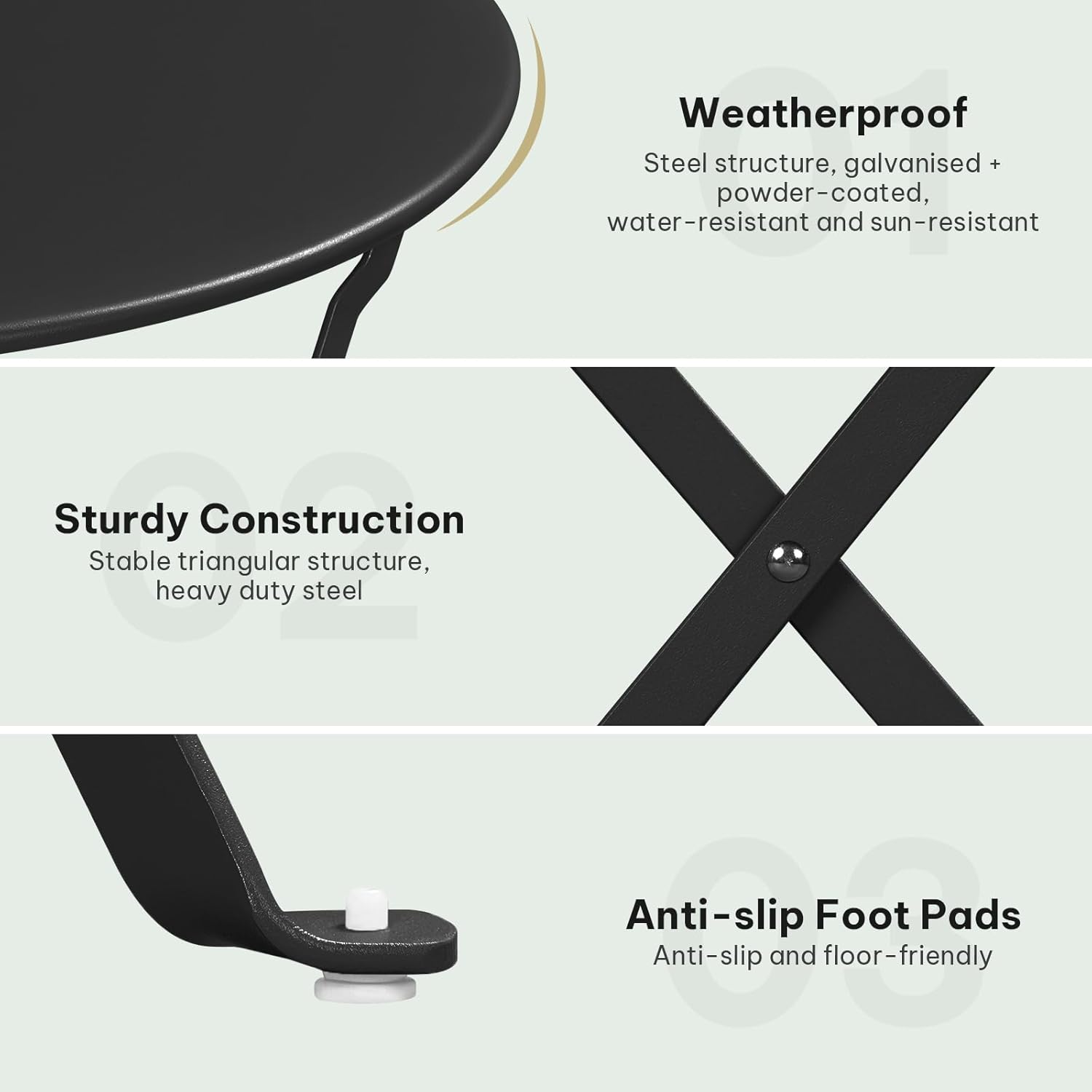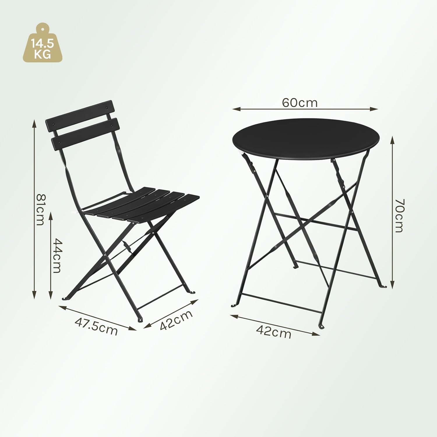 Stilingas ir patogus komplektas: sodo baldų rinkinį sudaro 1 apvalus sulankstomas stalas (Ø60 × H70 cm, iki 60 kg) ir 2 kėdės su atlošu (42 × 81 × 47,5 cm, iki 150 kg kiekviena). Modernus ir paprastas dizainas, sukurtas pagal ergonomikos principus, suteikia patogią vietą poilsiui su šeima ar draugais.