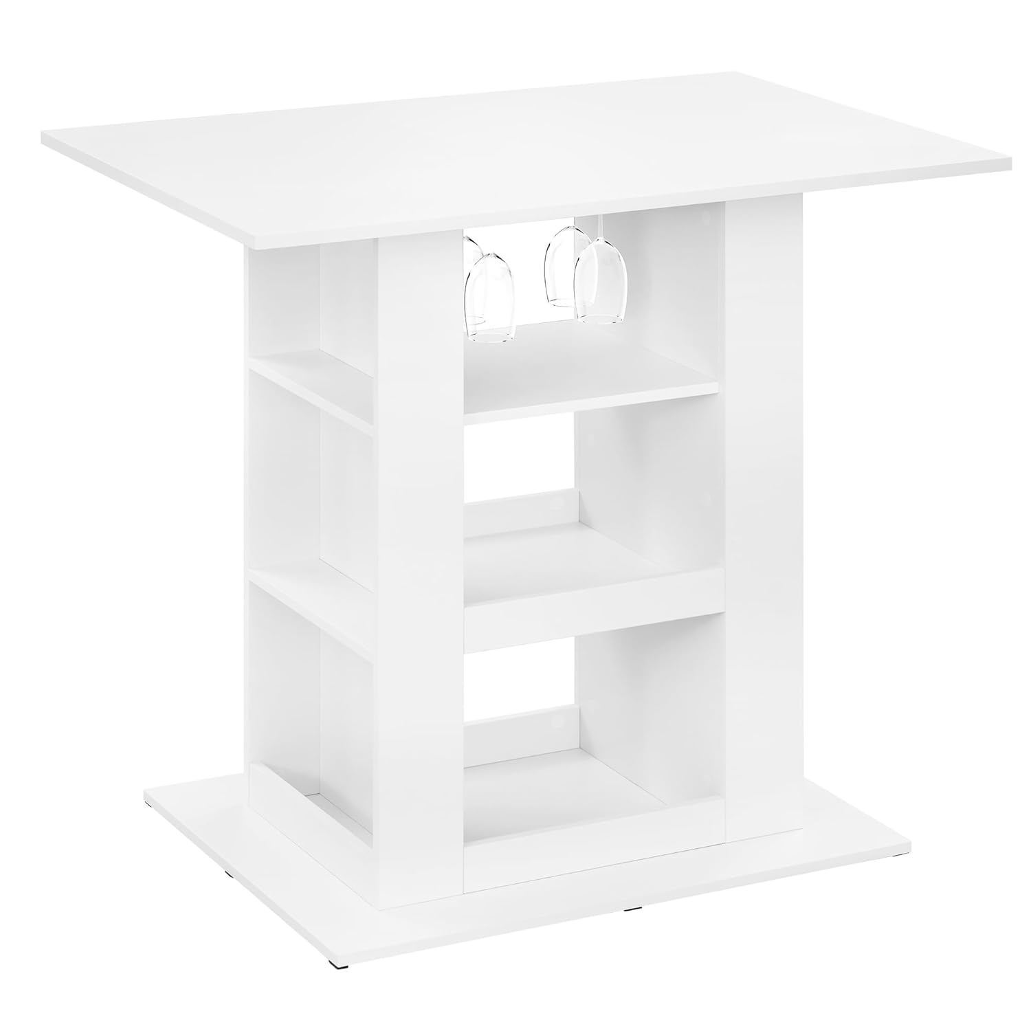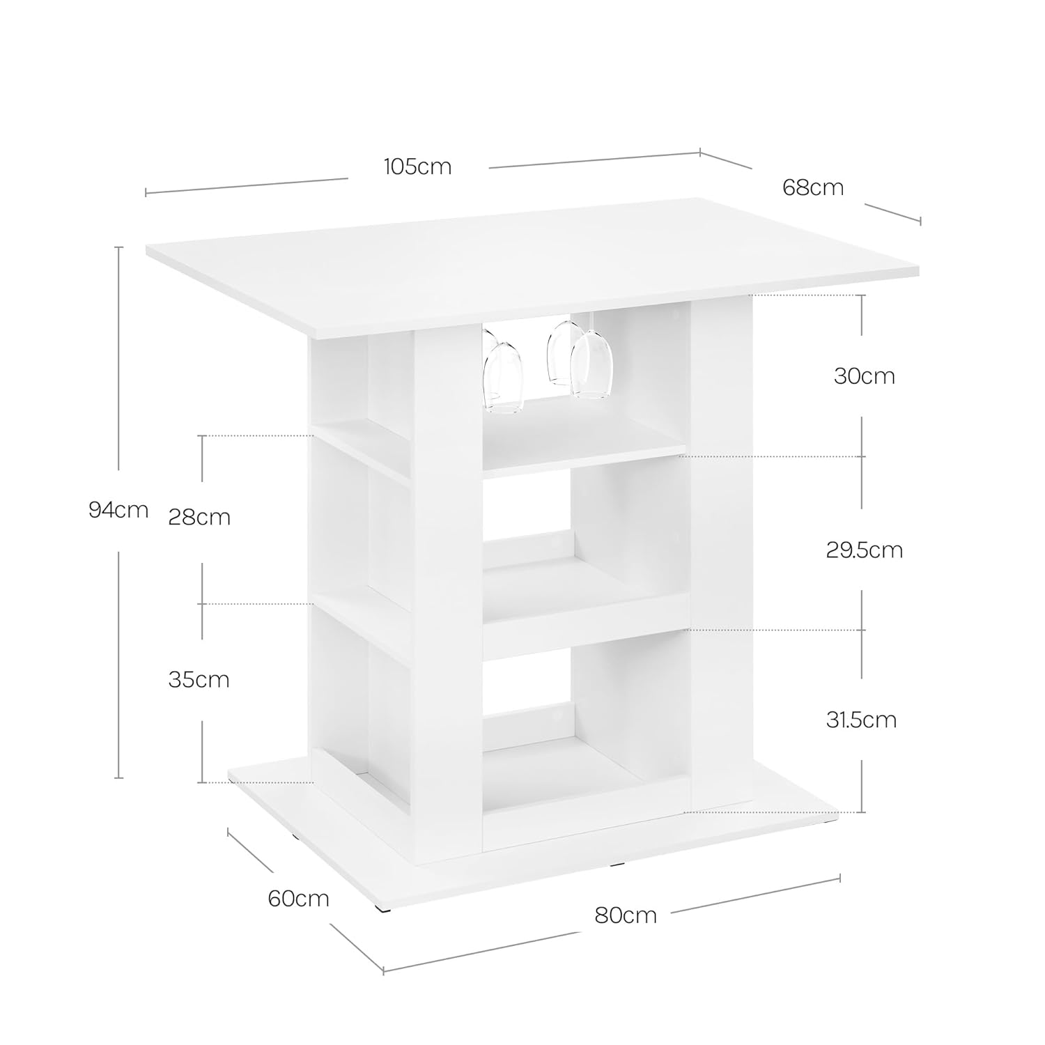 Baro stalas su lentynomis: ant erdvaus 105 × 68 cm stalviršio galima patogiai padėti maistą, gėrimus ar dekoracijas. Po stalviršiu yra 2 laikikliai taurėms, 3 atviri skyriai ir po 3 lentynas kiekvienoje pusėje, todėl turėsite daug vietos laikyti vyną, taures, prieskonius, stalo įrankius ar kitus daiktus.