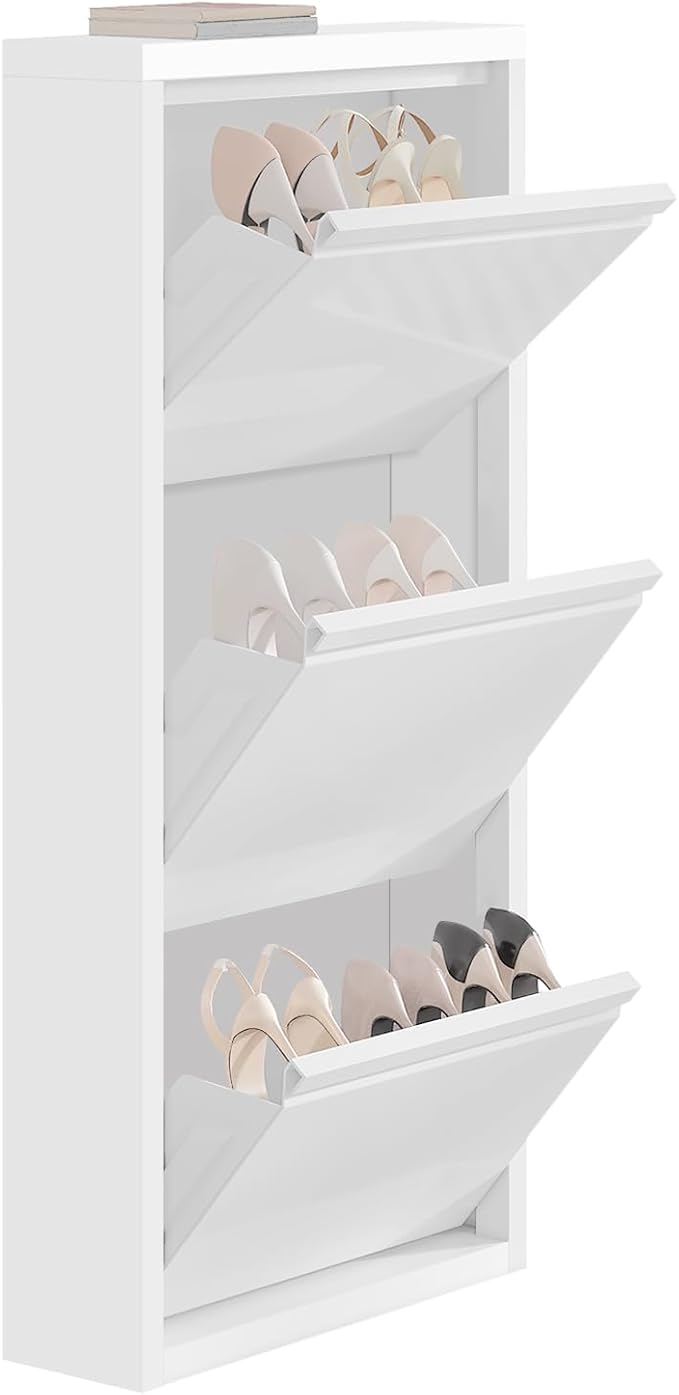 Minimalistinis ir modernus dizainas: 3 skyrių batų lentyna yra paprasta, bet moderni. Plonas korpusas ir atlenkiami dangčiai atrodo elegantiškai ir lengvai įsilieja į interjerą.