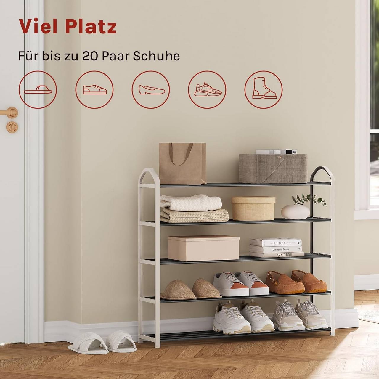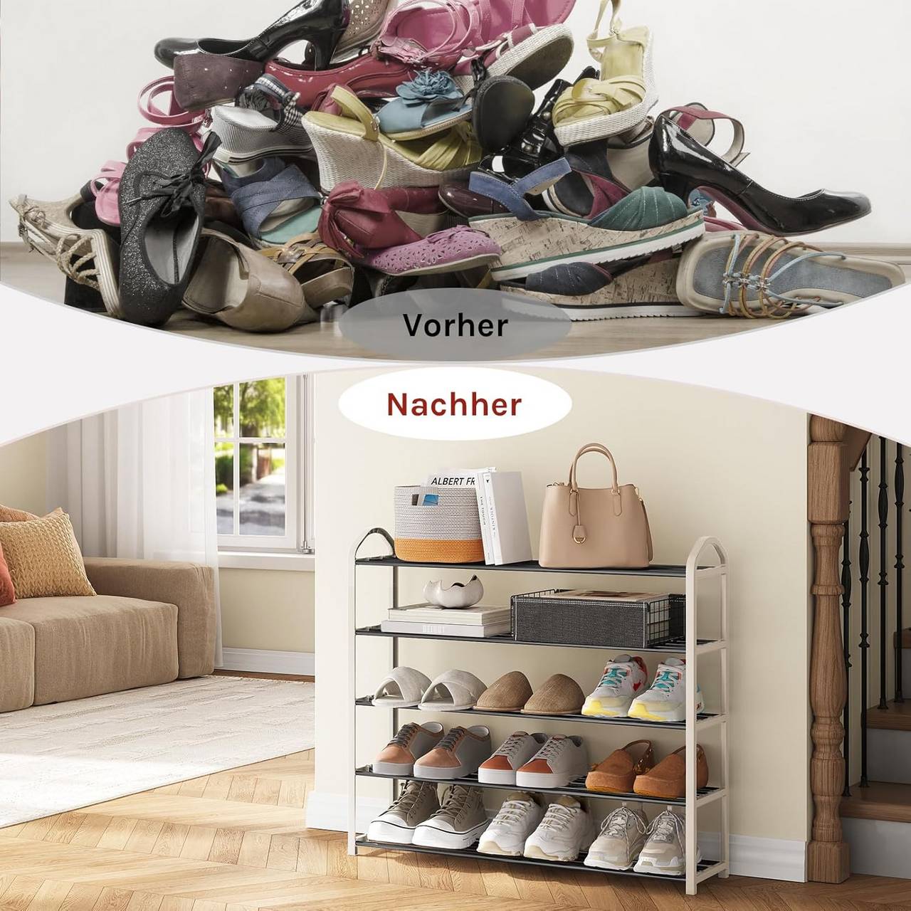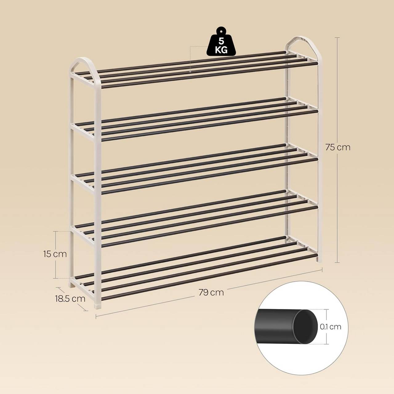 Didelė talpa: 5 aukštų lentyna suteikia daug vietos batams ar kitiems daiktams. Vieno aukšto aukštis – 17 cm. Lentynos yra nuimamos, todėl galima pritaikyti vietą aukštesniems batams, pvz., auliniams.