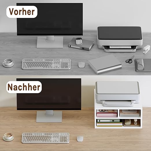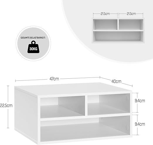 Pakankamai vietos: ši WOLTU lentynėlė/dėklas yra puikus biuro laikymo sprendimas. Platus viršus patogiai tinka spausdintuvui, faksui, skeneriui ir pan., o 3 skyriai skirti biuro reikmenims, dokumentams, knygoms, spausdintuvo popieriui ir kt.