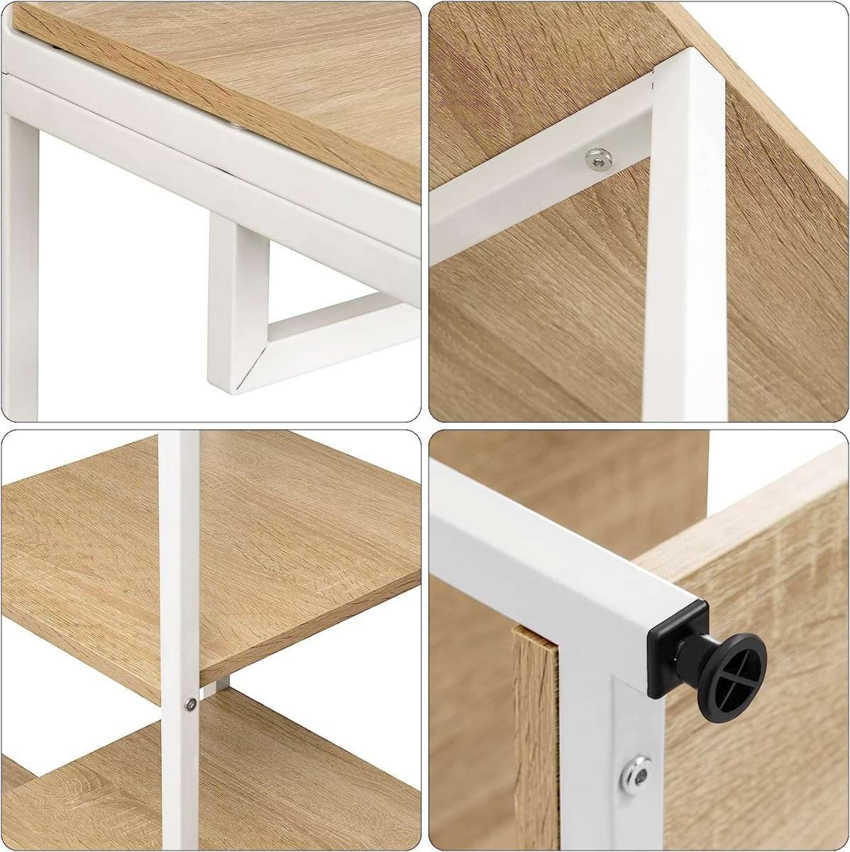 Apgalvotos detalės: stovo gale yra X formos metaliniai sutvirtinimai, didinantys stabilumą. Pakelta apatinė plokštė apsaugo tiek ją, tiek ant jos laikomus daiktus nuo drėgmės ir vandens.