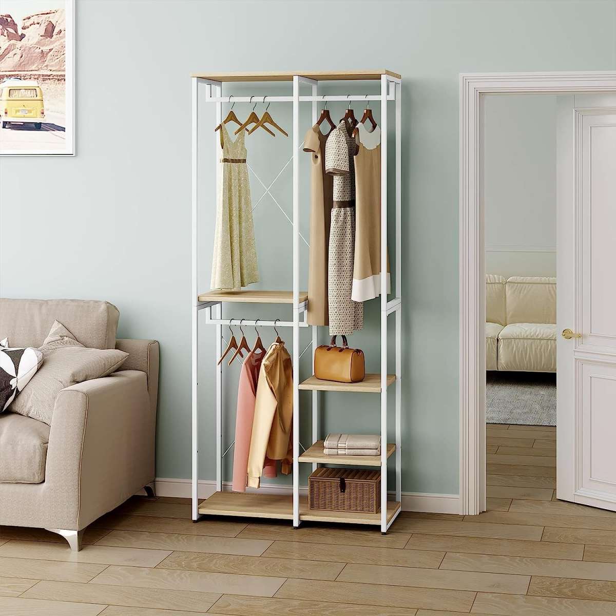 Praktiška drabužių kabykla: ši atvira drabužių kabinimo sistema suteikia daug vietos daiktams. 2 kabyklų strypai skirti paltams, sijonams ir kitiems drabužiams, o apatinės lentynos puikiai tinka laikymo dėžėms, batams ir rankinėms.