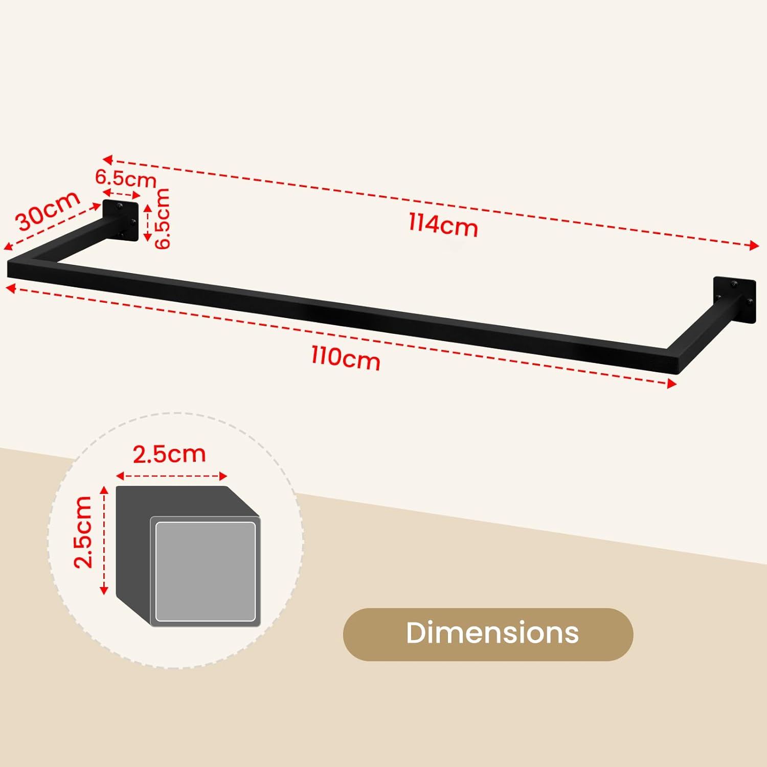ILGAAMŽĖ: sieninė drabužių kabyklos juosta pagaminta iš milteliniu būdu padengtų kvadratinių vamzdžių (25 x 25 mm, 1,2 mm sienelės storio). Ji yra tvirta, nerūdijanti, stabili ir patvari. Tvirtos pagrindo plokštės leidžia ją saugiai pritvirtinti prie sienos. Maksimali apkrova – 50 kg.