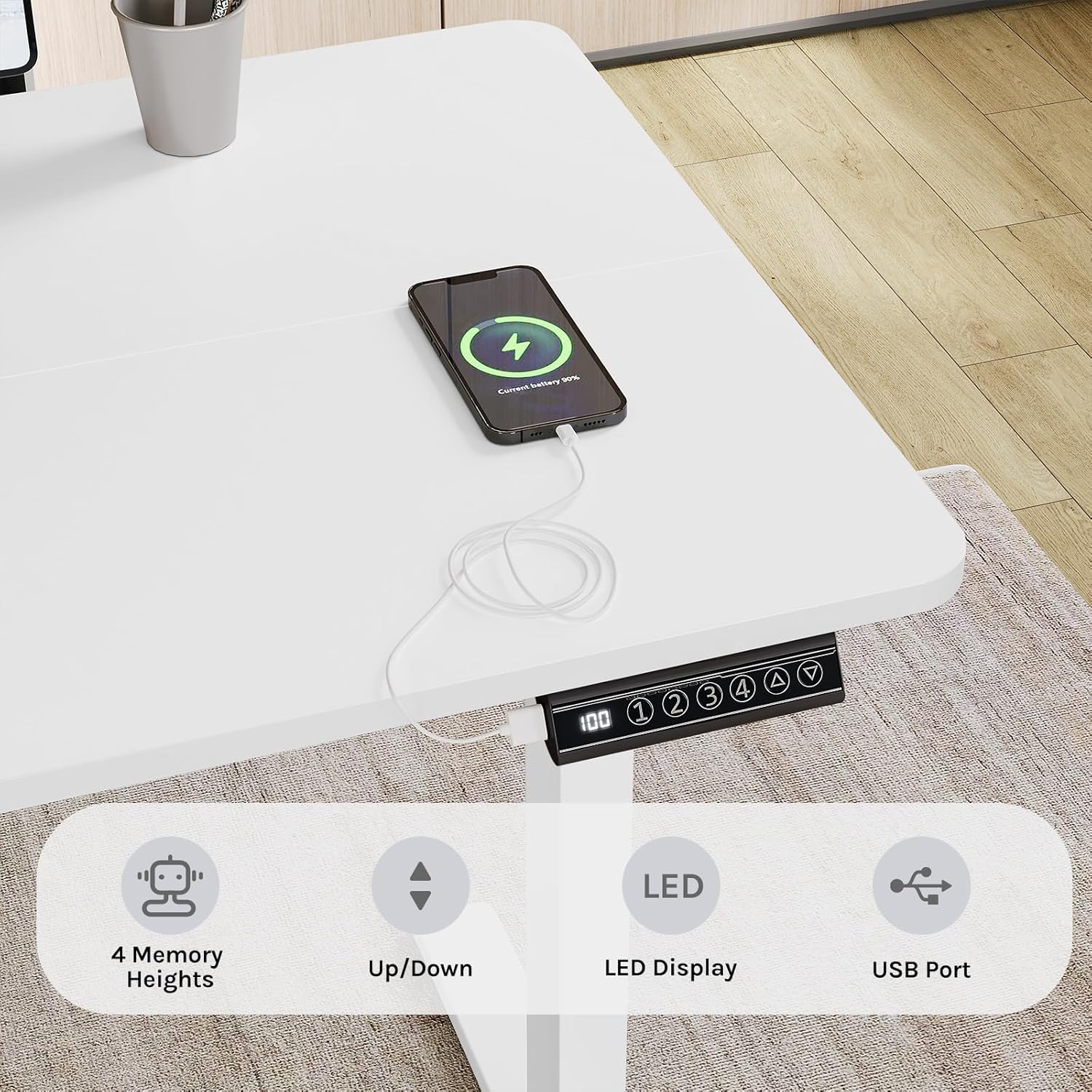 Apgalvotas dizainas: valdymo panelėje yra USB jungtis telefonams ar kitiems įrenginiams krauti. Komplekte taip pat yra 4 kabelių laikikliai ir kabliukas ausinėms ar kuprinei, kad darbo vieta būtų tvarkinga.