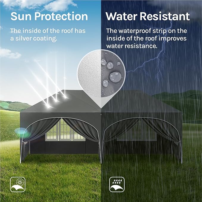 Apsauga nuo UV ir atsparumas vandeniui: stogas pagamintas iš 210D „Oxford“ audinio su sidabrine danga, kuris yra atsparus lietui ir sulaiko 98 % UV spindulių (UV apsaugos faktorius 50+), suteikdamas patikimą pastogę lauko veikloms.