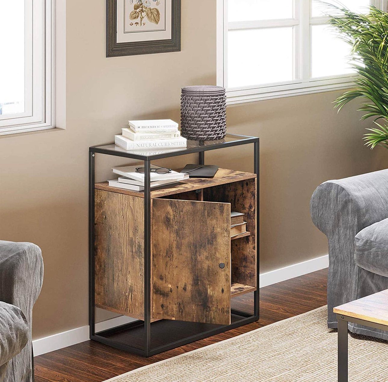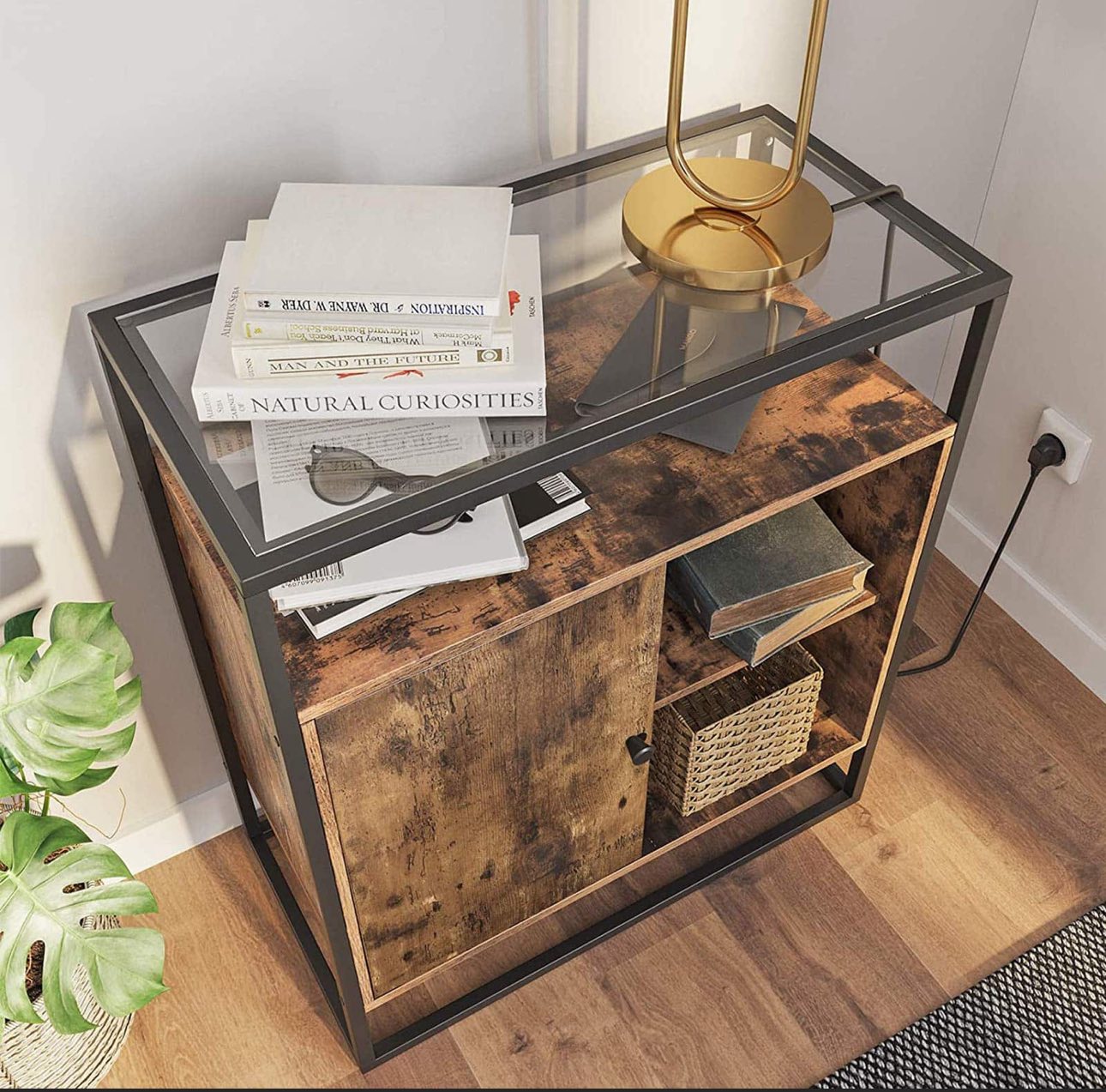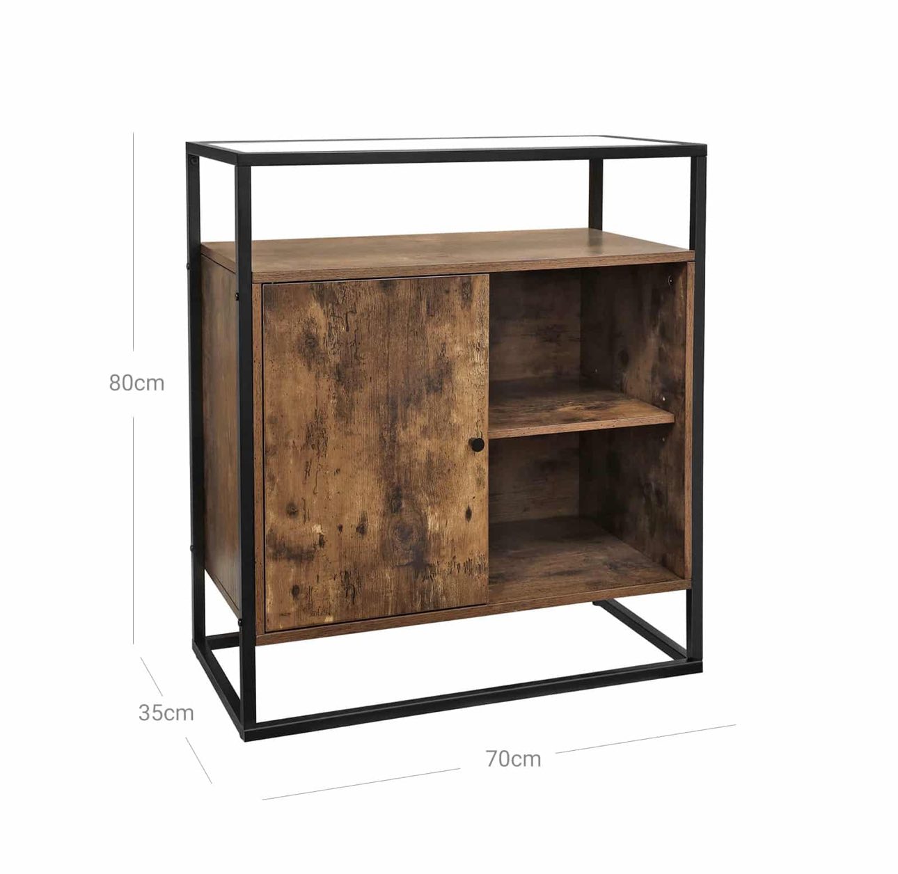 Spalva: sendintos rudos ir juodos derinysMedžiaga: grūdintas stiklas, medžio drožlių plokštė, plienasGaminio matmenys: 70 × 35 × 80 cm (ilgis × plotis × aukštis)Svoris: 20,2 kg