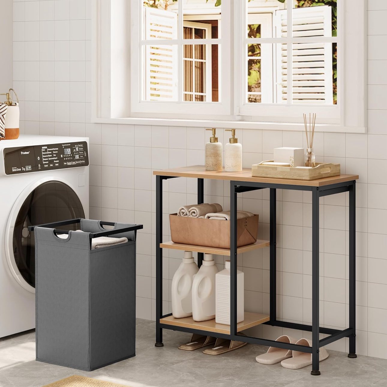 / Lentyna su skalbinių krepšiu