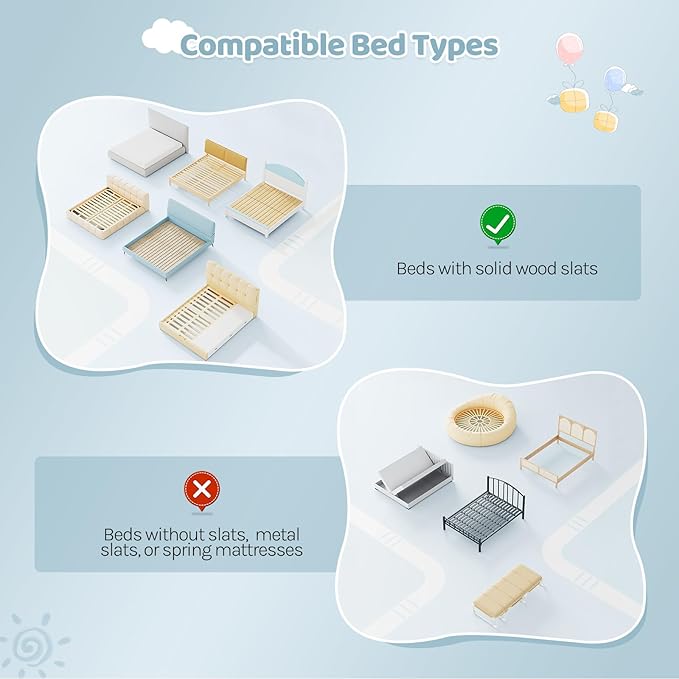 Reguliuojamas aukštis augant vaikui: aukštį galima reguliuoti laisvai, nereikia jokių įrankių. Tinka 5–30 cm storio čiužiniams, todėl lengvai pritaikoma augant kūdikiui ir prailgina naudojimo laiką.