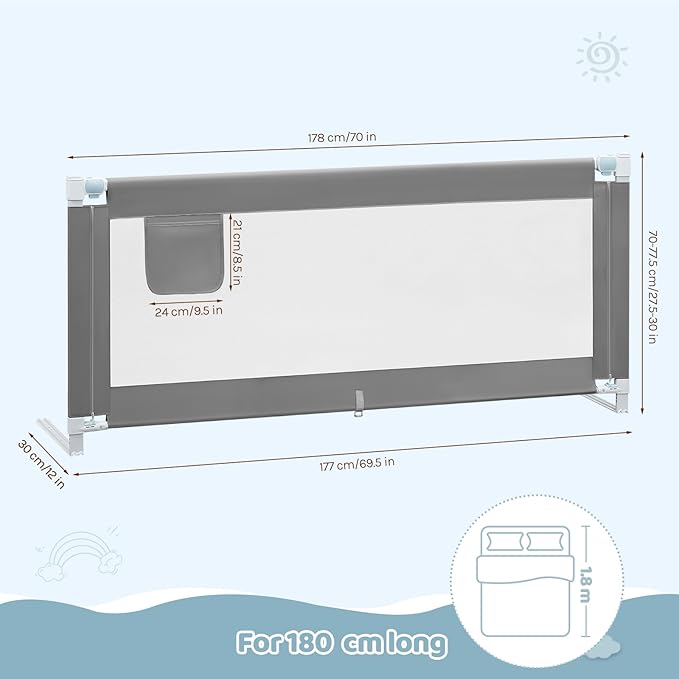 AUGIMUI PRITAIKYTA KONSTRUKCIJA: Aukštis reguliuojamas be įrankių, todėl apsaugą galima pritaikyti prie 5–30 cm storio čiužinių. Tai leidžia naudoti ilgiau, prisitaikant prie vaiko augimo.