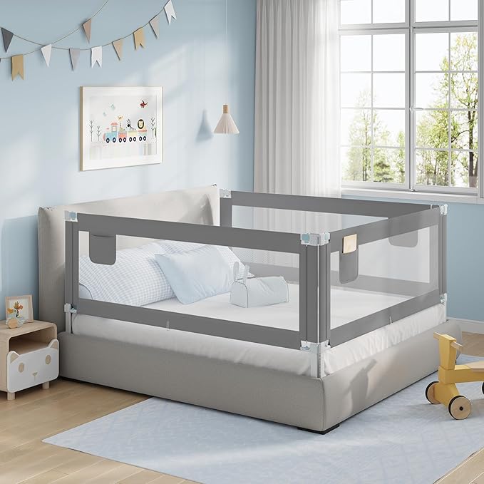 DVIPUSĖ SAUGUMO APSAUGA: Metalinis rėmas su L formos jungtimi užtikrina visišką prigludimą tarp čiužinio ir apsaugos, be jokių tarpų. Dvigubas užrakinimo mechanizmas apsaugo nuo netyčinio atidarymo vaikui, todėl miego metu užtikrinamas saugumas iš visų pusių.