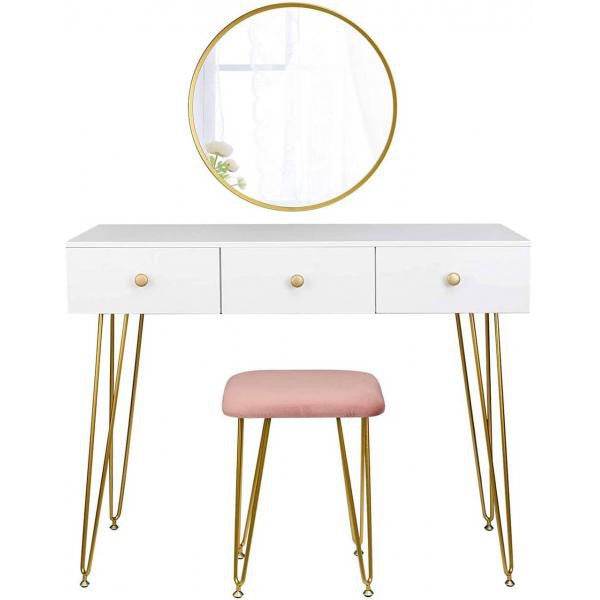 Makiažo staliukas su veidrodžiu ir taburetėle, su 2 stalčiais, 100 x 40 x 75 cm (ilgis x plotis x aukštis), Baltas