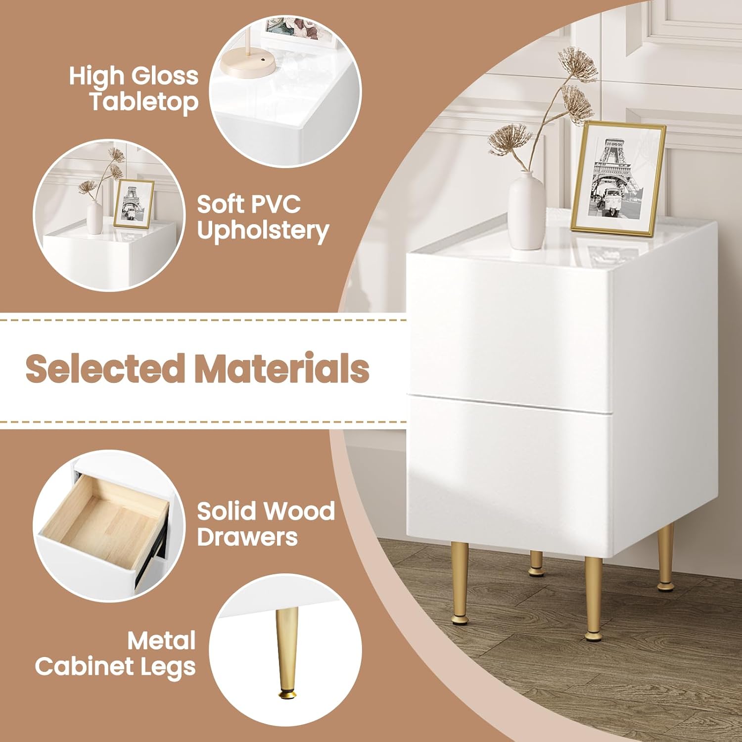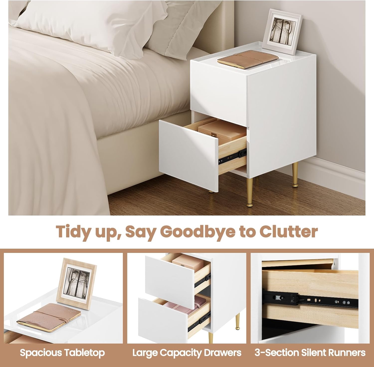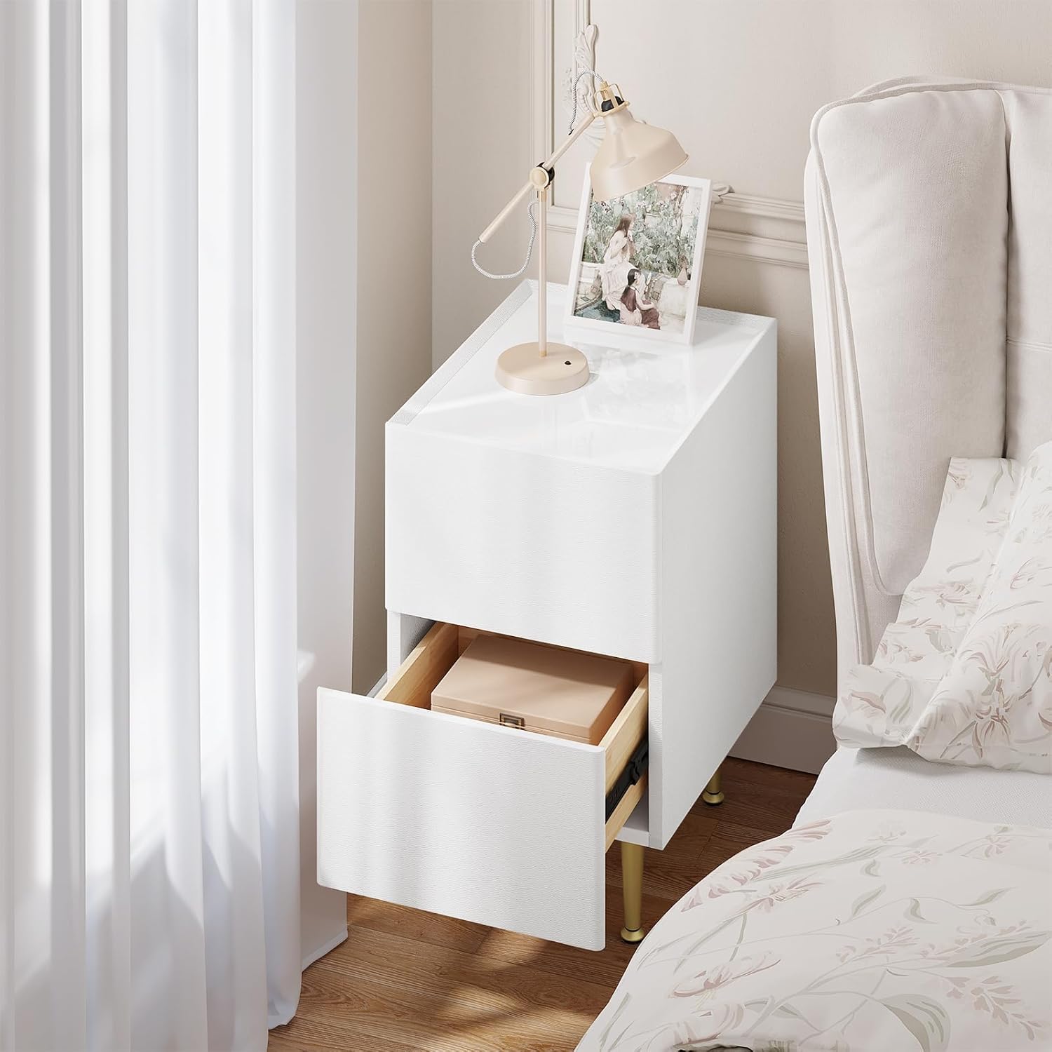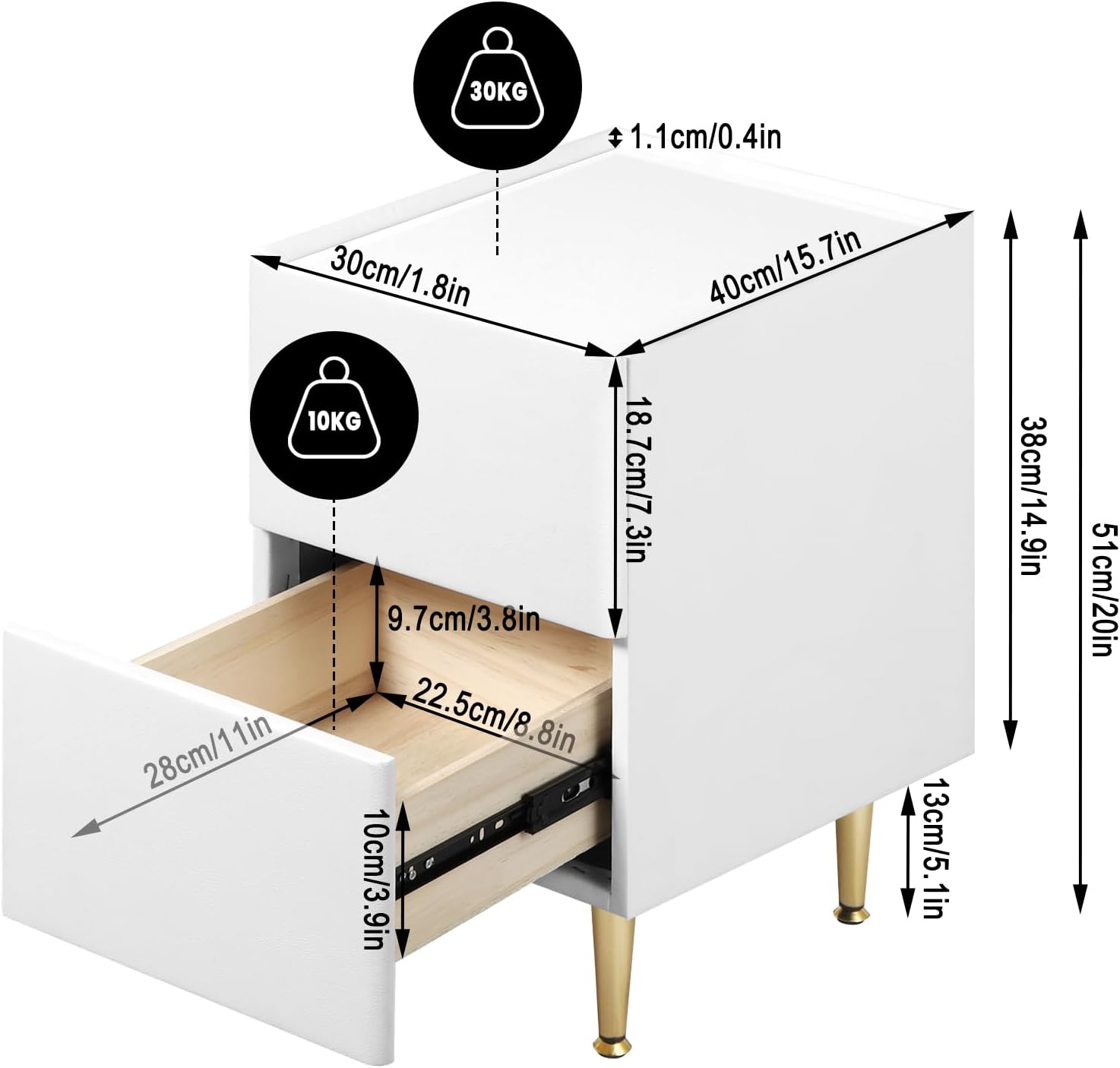 Didelė laikymo erdvė: naktinis staliukas turi platų stalviršį ir 2 didelius medinius stalčius. Stalčiai su metaliniais bėgeliais atsidaro sklandžiai ir tyliai, todėl patogiai laikysite kasdien naudojamus daiktus.