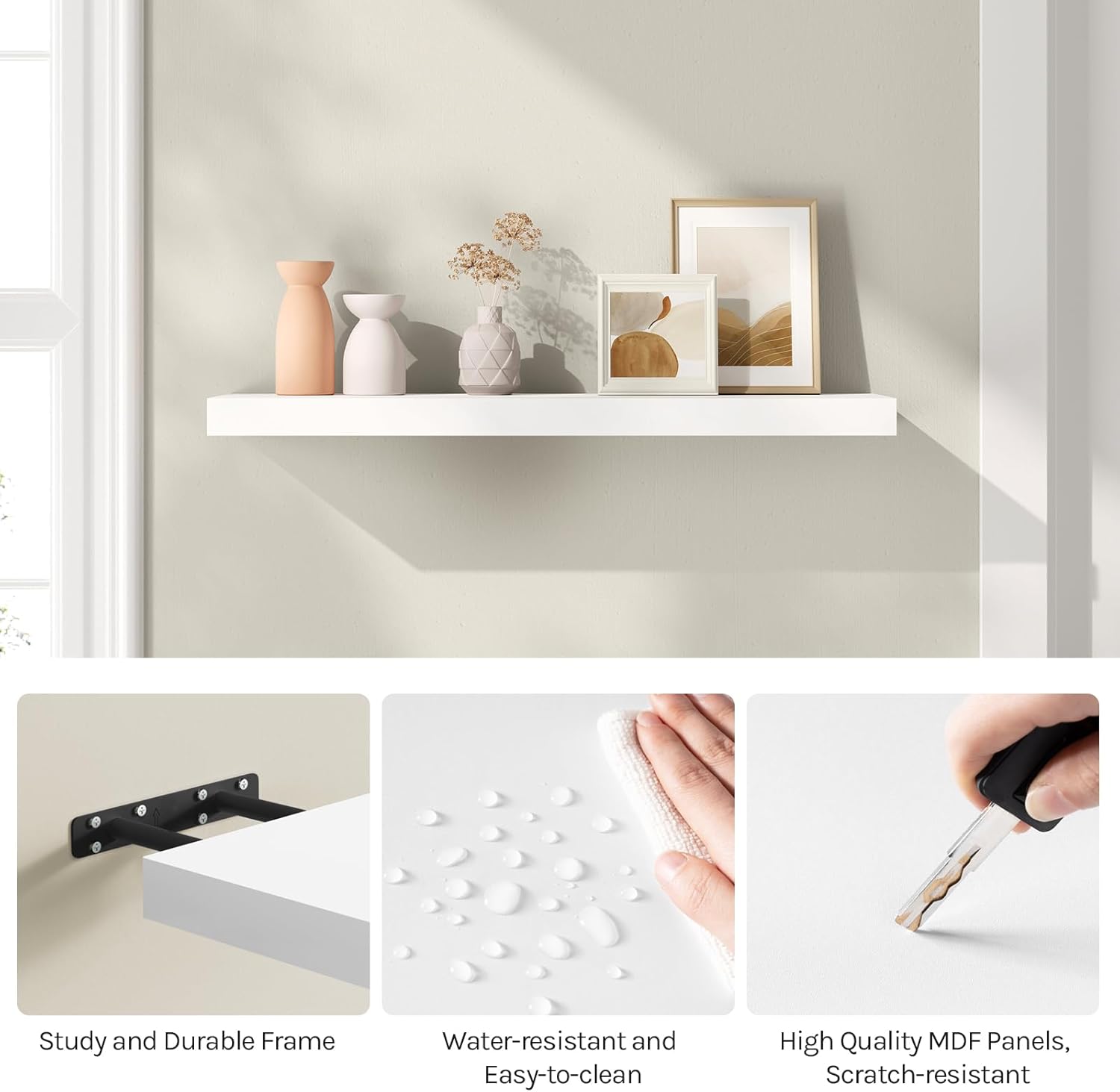 Lengvas montavimas: pakabinama lentyna turi paslėptus tvirtinimus be matomų laikiklių, todėl atrodo estetiškai ir moderniai. Komplekte yra sieniniai laikikliai, varžtai, kaiščiai ir aiškios montavimo instrukcijos.