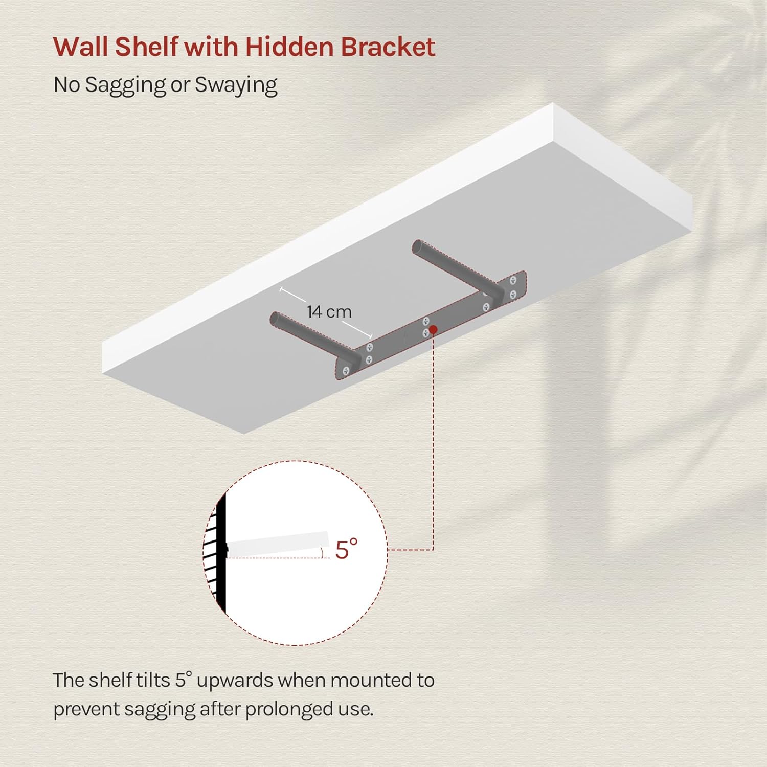 Tvirta pakabinama lentyna: pagaminta iš aukštos kokybės MDF plokštės, todėl lentyna yra atspari drėgmei ir vandeniui, nesideformuoja ir turi lengvai valomą paviršių. Ilgaamžė konstrukcija gali išlaikyti iki 10 kg svorį.
