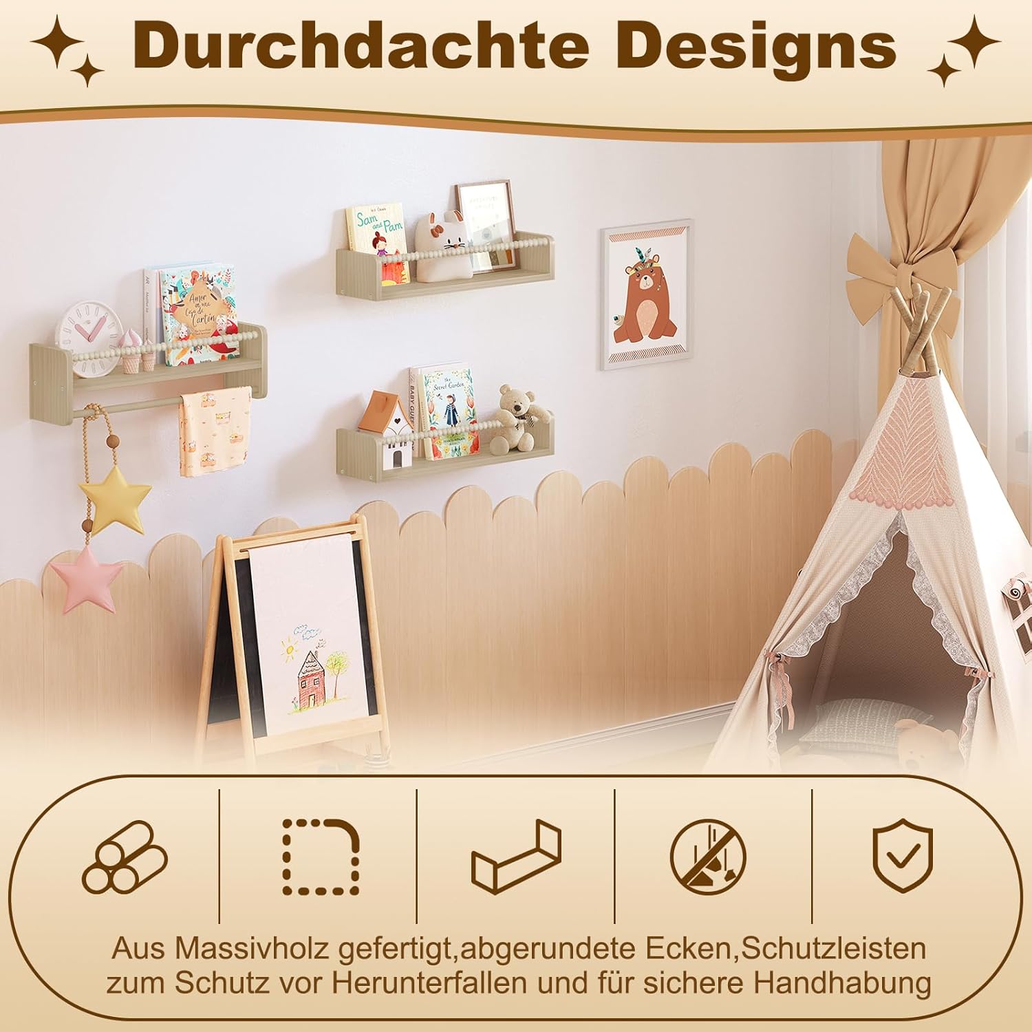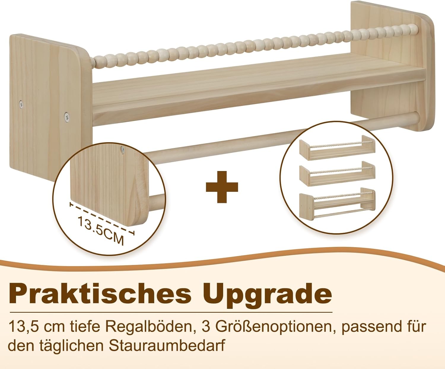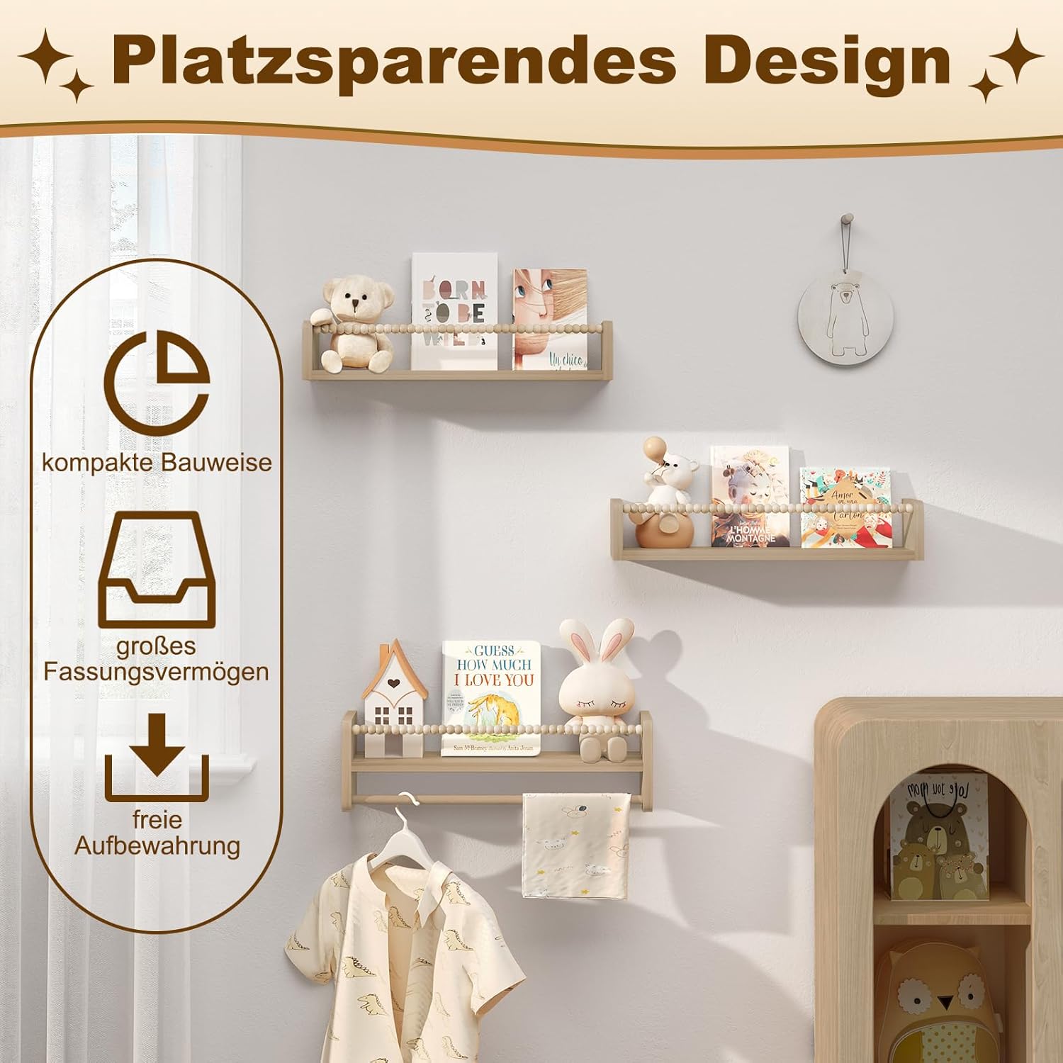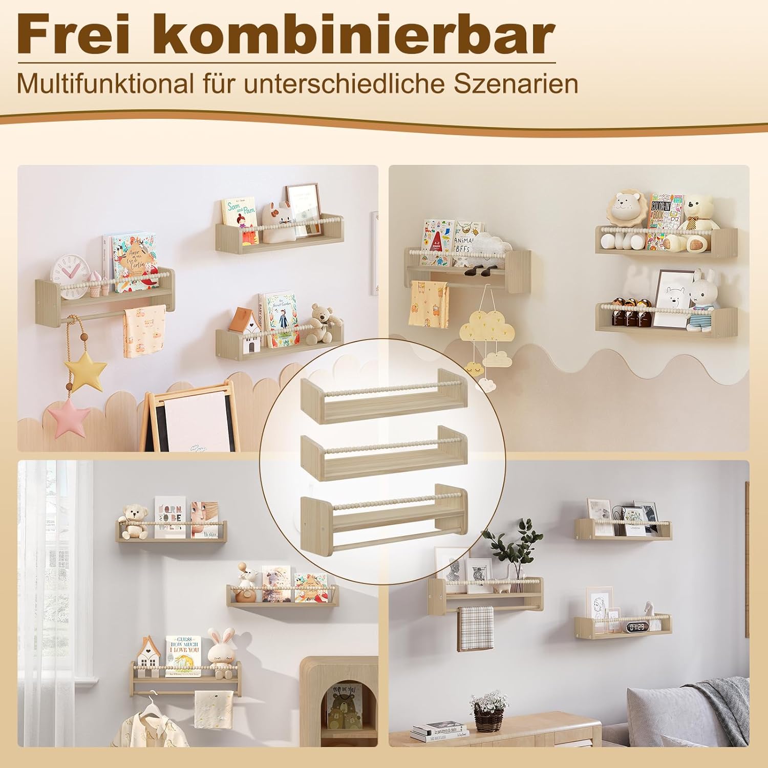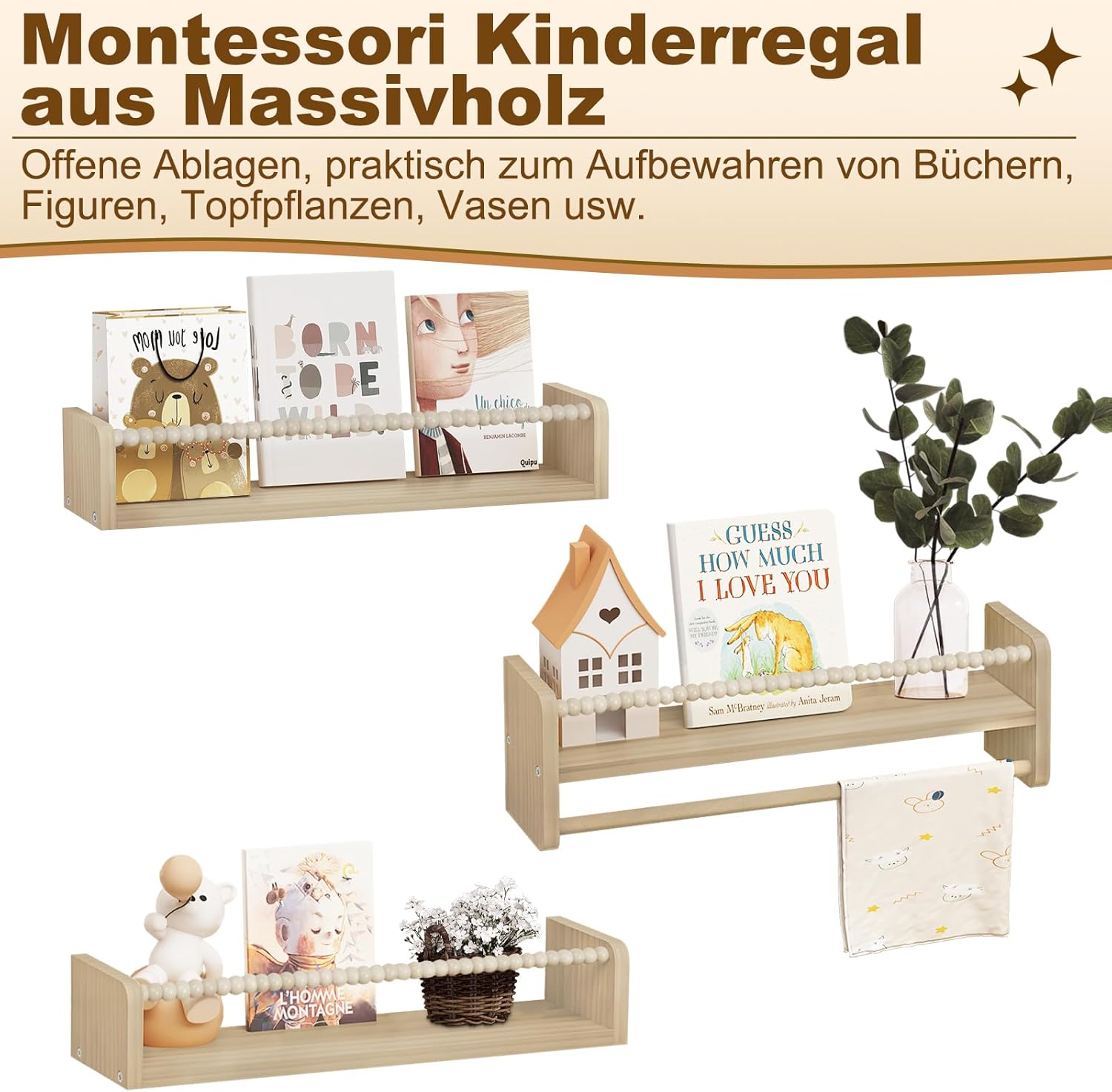 WOLTU 3 dalių vaikų lentynų rinkinys – 50 cm sieninės lentynos vaikų kambariui, pagamintos iš medžio masyvo. Natūralios medžio spalvos, pakabinamos („floating“) lentynos puikiai tinka knygoms, žaislams ar dekoracijoms laikyti. Montessori stiliaus dizainas skatina vaikus savarankiškai pasiekti ir tvarkyti savo daiktus.