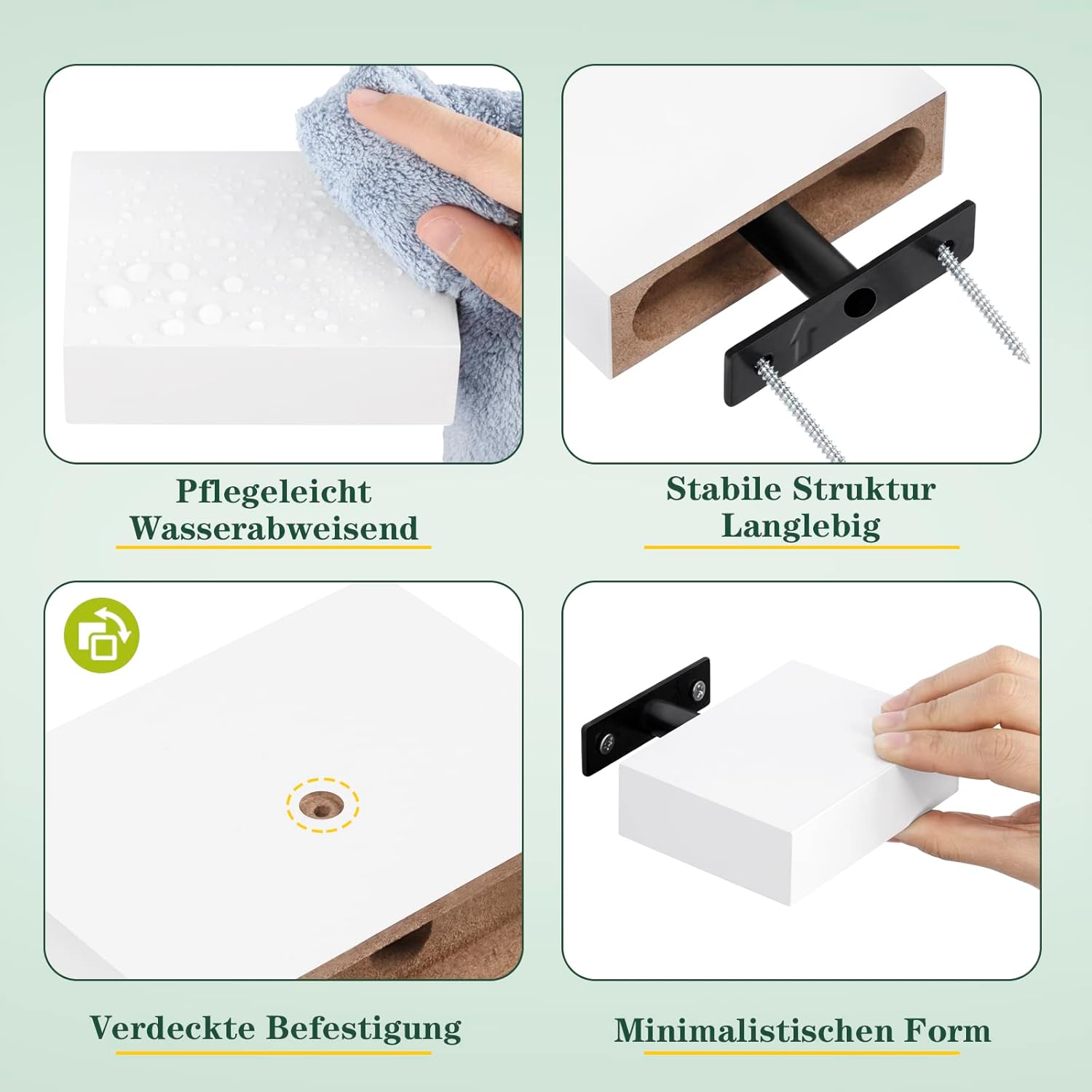 Paslėptas metalinis laikiklis: kiekviena sieninė lentyna gali atlaikyti iki 10 kg apkrovą, todėl knygos, smulkūs buitiniai prietaisai ar kiti daiktai laikosi stabiliai ir nesvyruoja. Tvirtinimo elementai nematomi, todėl išlaikoma švari ir estetiška išvaizda.