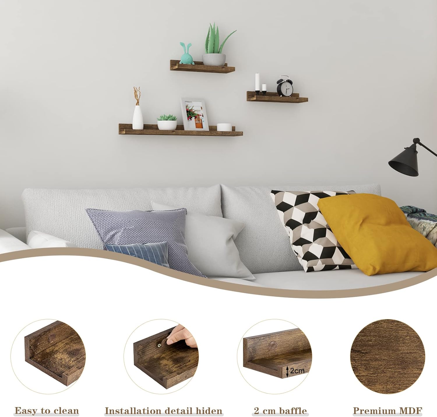 Kokybiška medžiaga: sieninė lentyna pagaminta iš aukštos kokybės MDF plokštės, todėl yra tvirta ir patvari. Vintage rudos spalvos paviršius suteikia baldui stilingą išvaizdą.