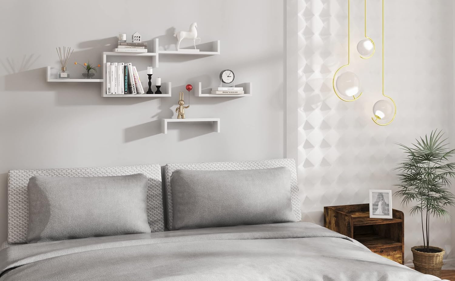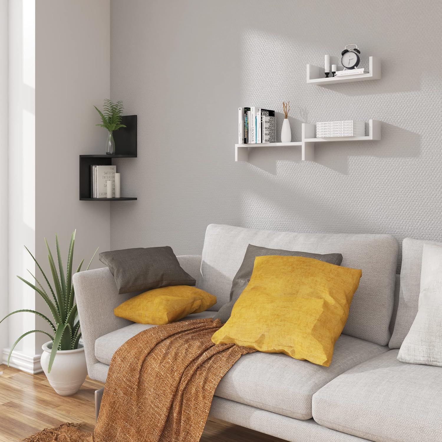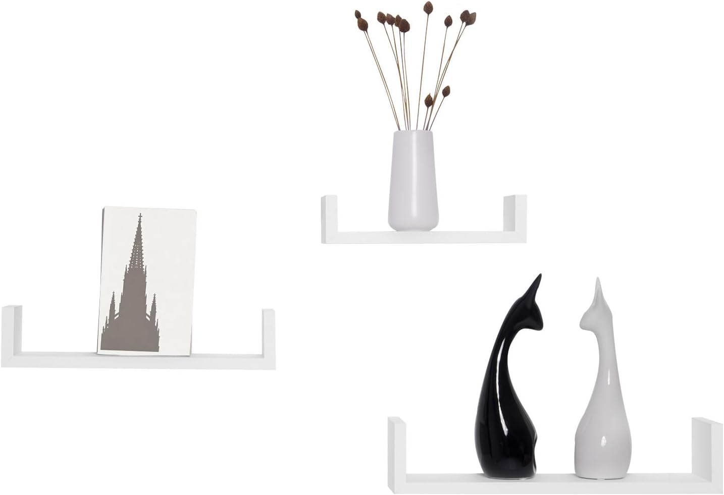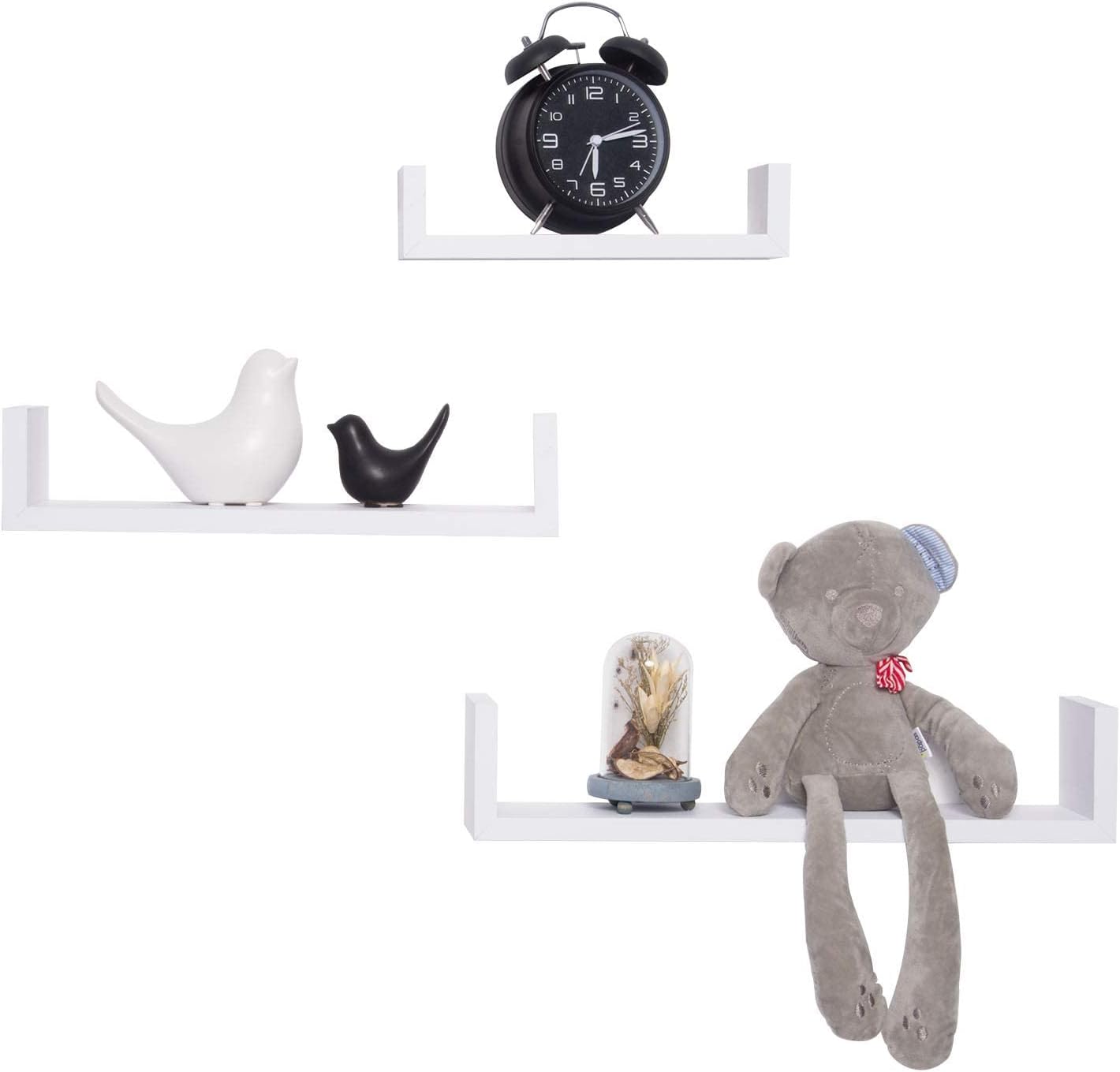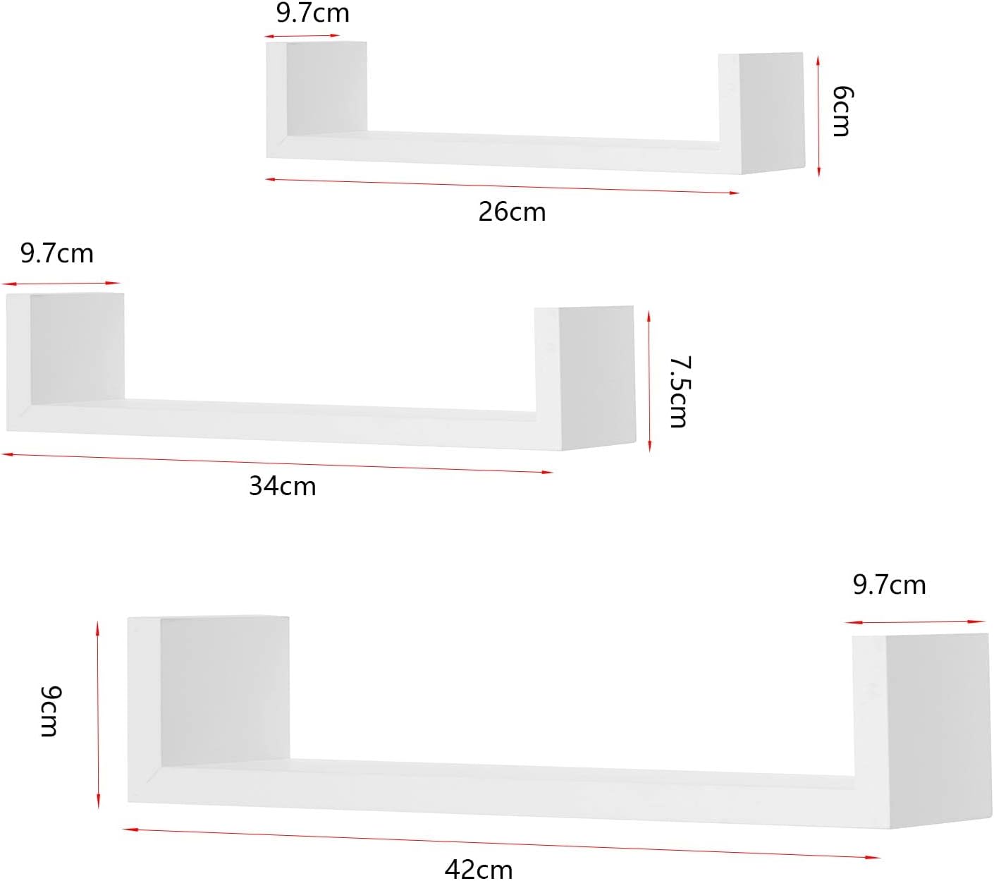 Ką gausite: 3 U formos sienines lentynas skirtingų dydžių – 26 x 9,7 x 6 cm, 34 x 9,5 x 7,5 cm ir 42 x 9,7 x 9,8 cm (plotis x gylis x aukštis). Galimi įvairūs spalvų variantai, todėl lentynas galite derinti skirtingais būdais ir suteikti tuščiai sienai daugiau išskirtinumo.