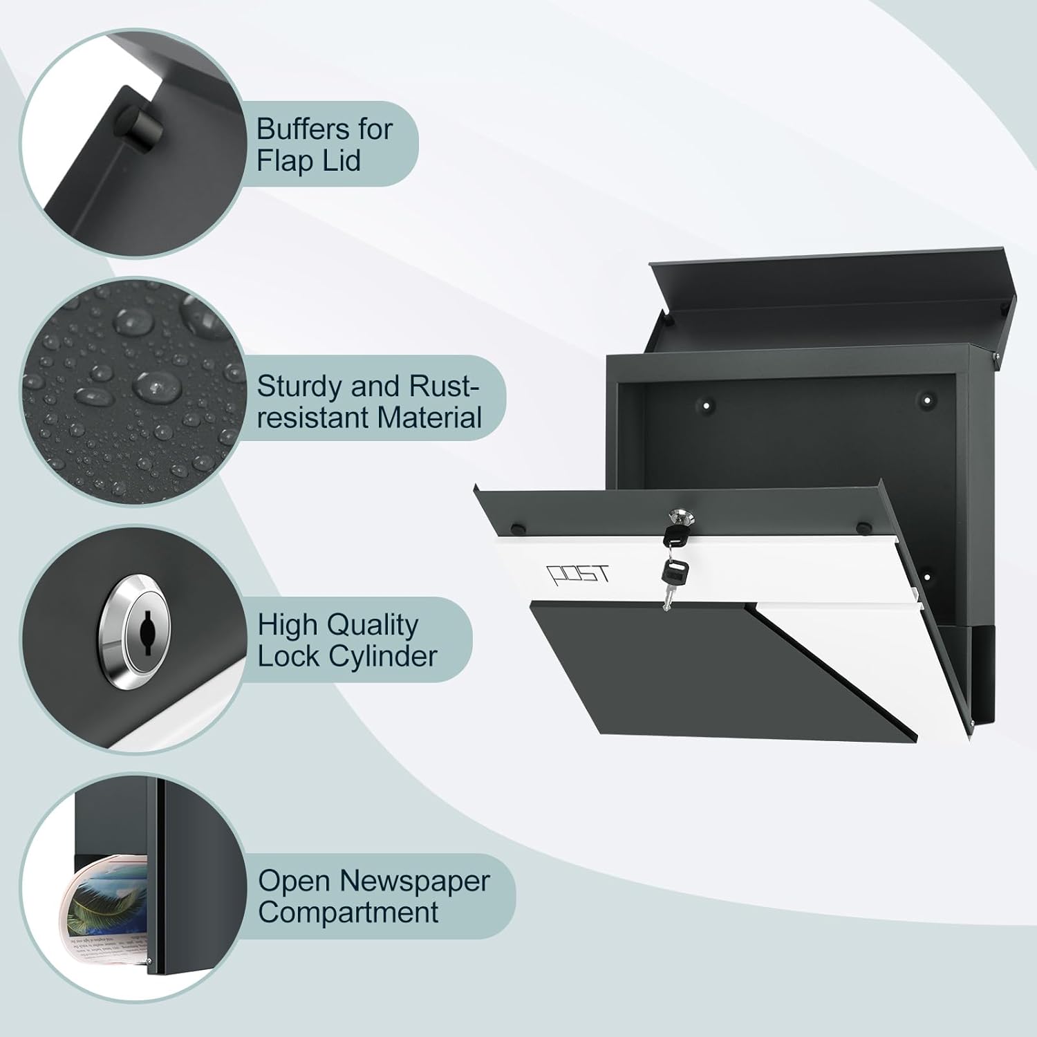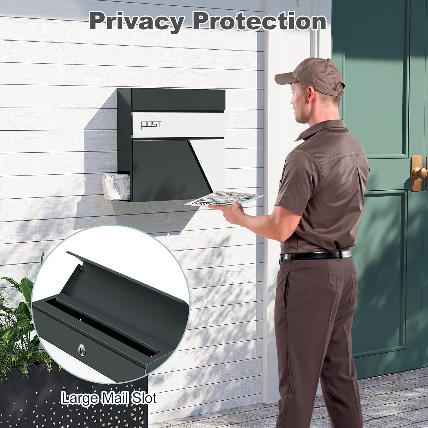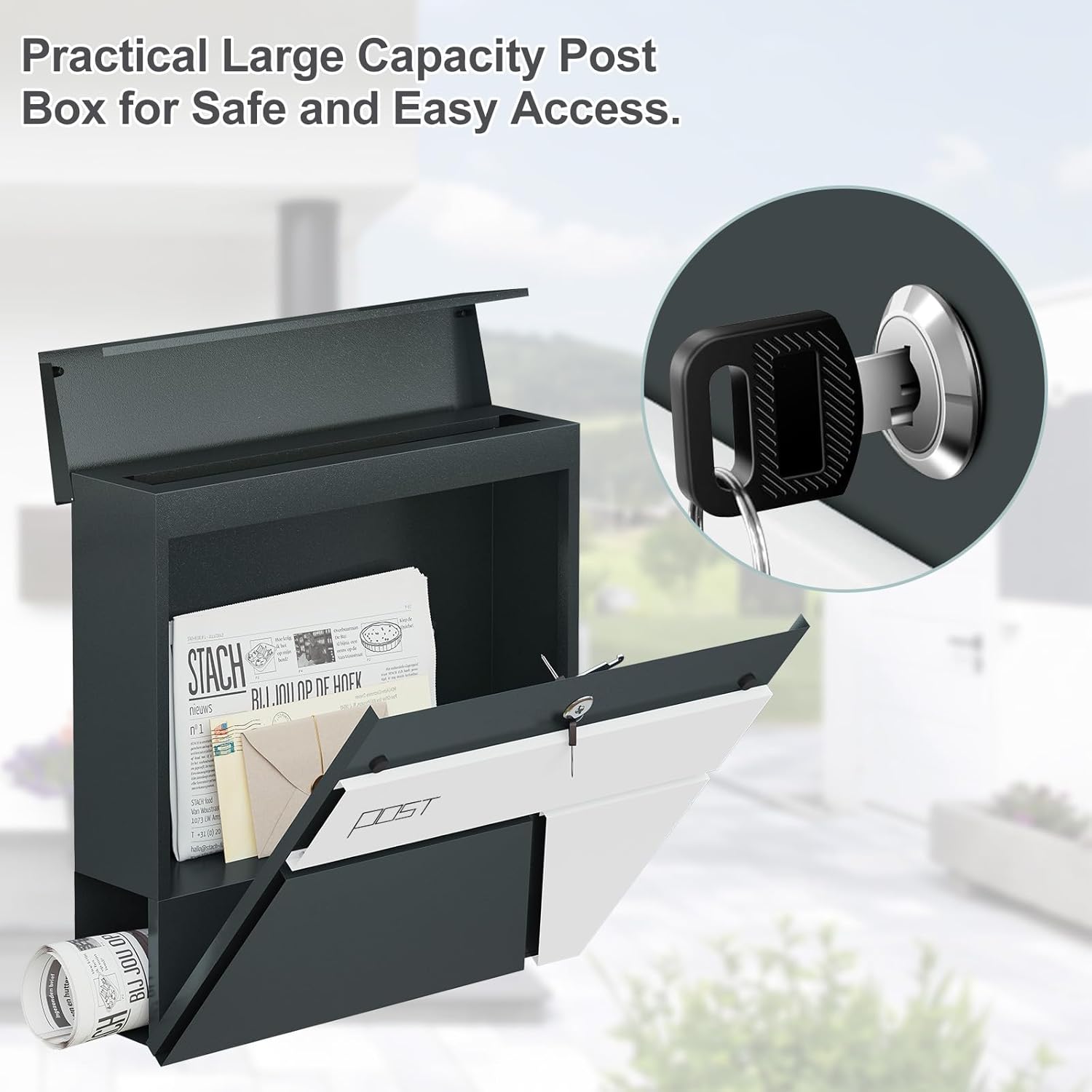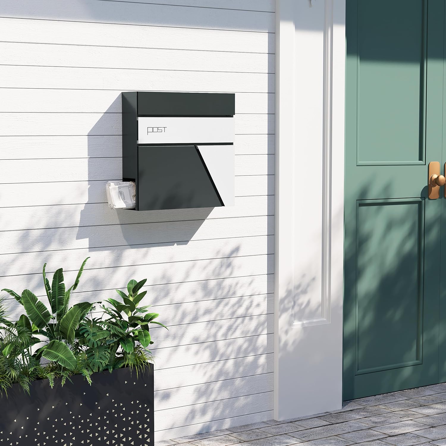 Modernus dizainas: kontrastingų spalvų (antracito ir baltos) sieninė pašto dėžutė atrodo moderniai ir elegantiškai. Estetiškos linijos ir geometrinės formos puikiai papildo bet kurio įėjimo zonos stilių.