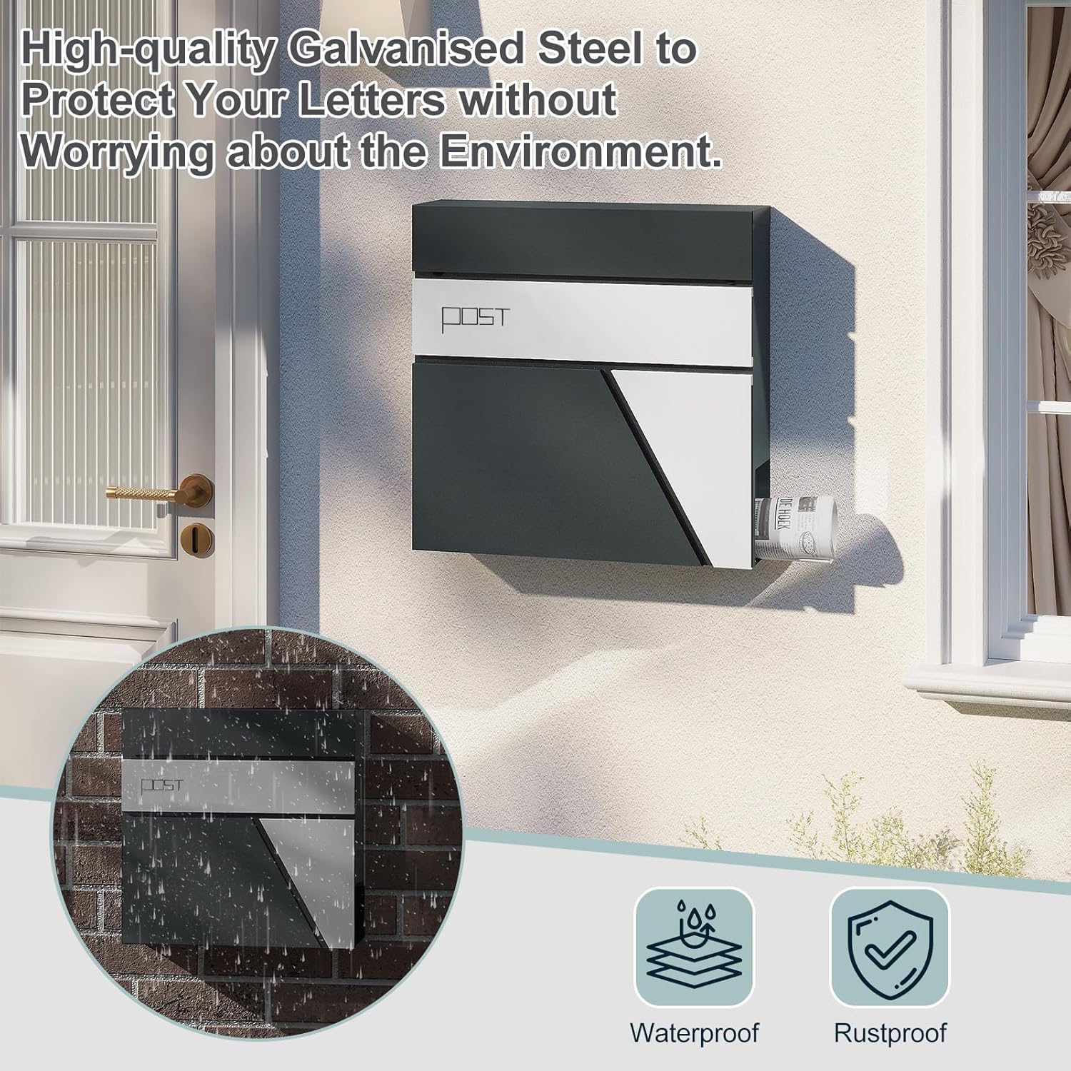 Apsauga nuo lietaus: viršutinis dangtelis visiškai uždengia laiškų įmetimo angą ir apsaugo laiškus nuo lietaus, vėjo bei pažeidimų. Taip pat apsaugomas ir užraktas.