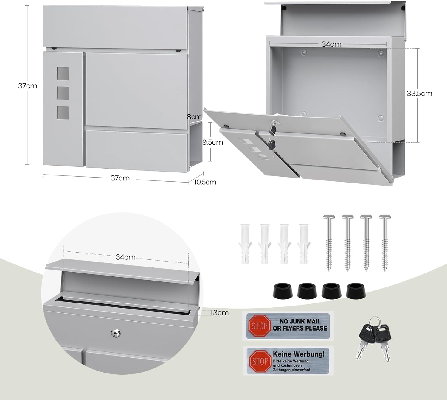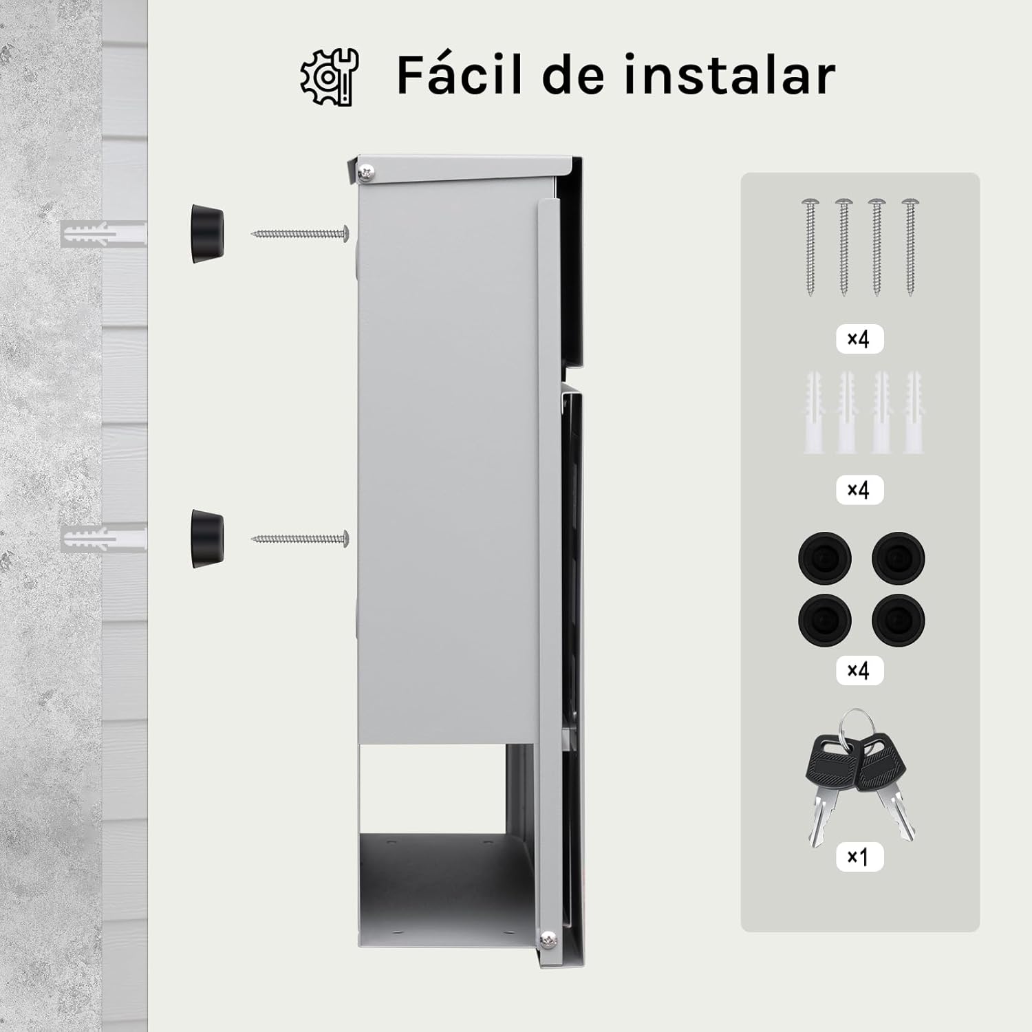 Lengvas montavimas: komplekte yra visi reikalingi tvirtinimo elementai ir instrukcija, todėl pašto dėžutę lengvai pritvirtinsite net be patirties.