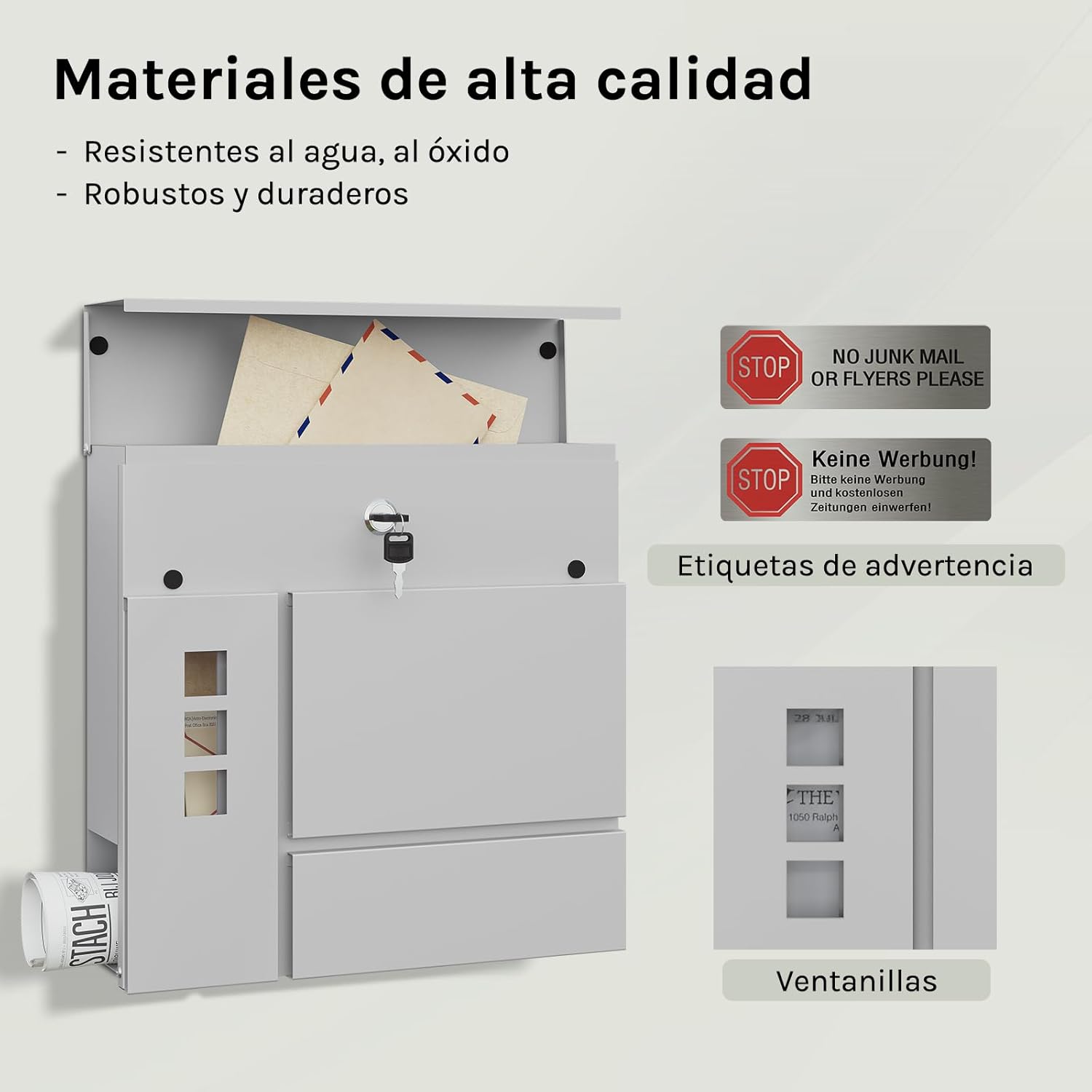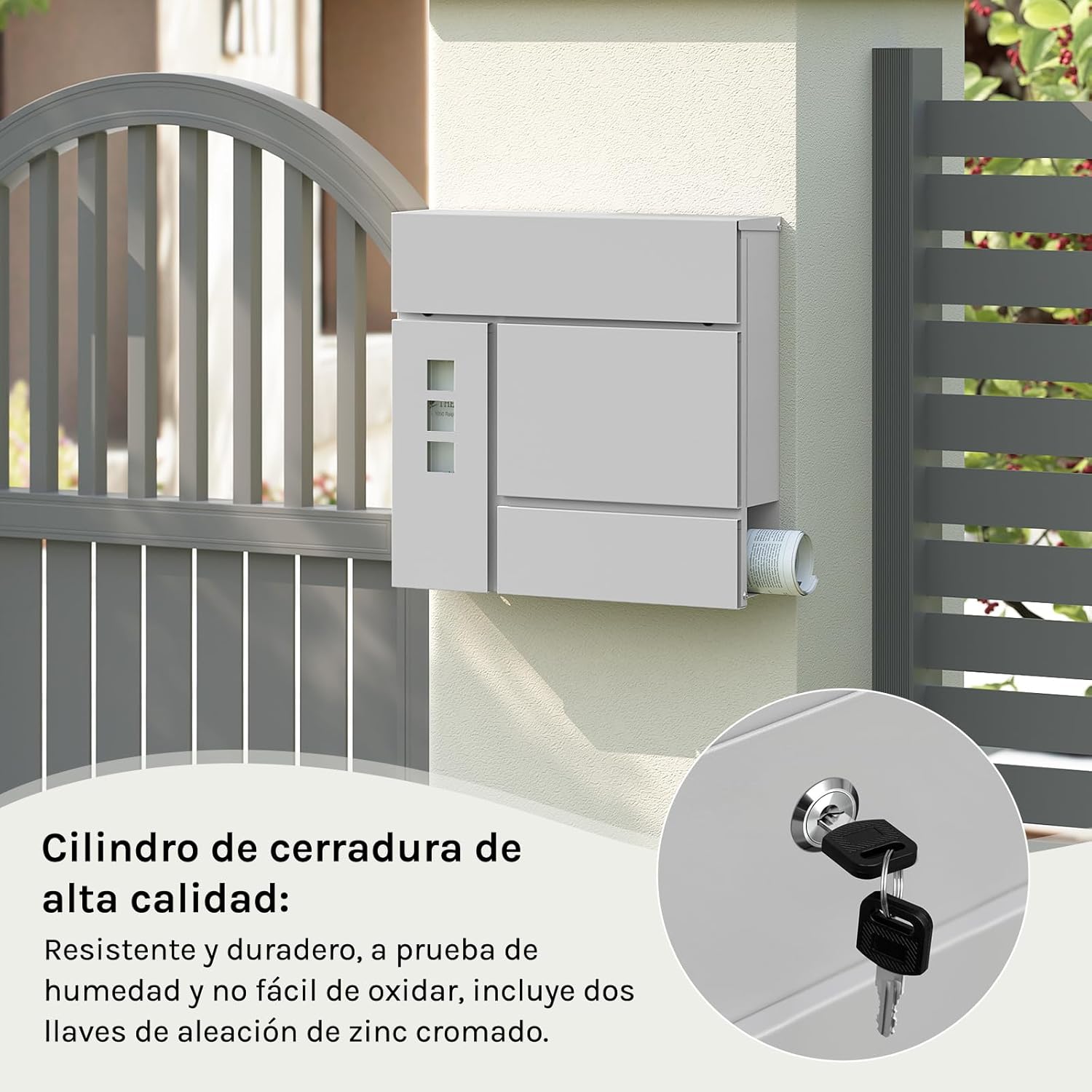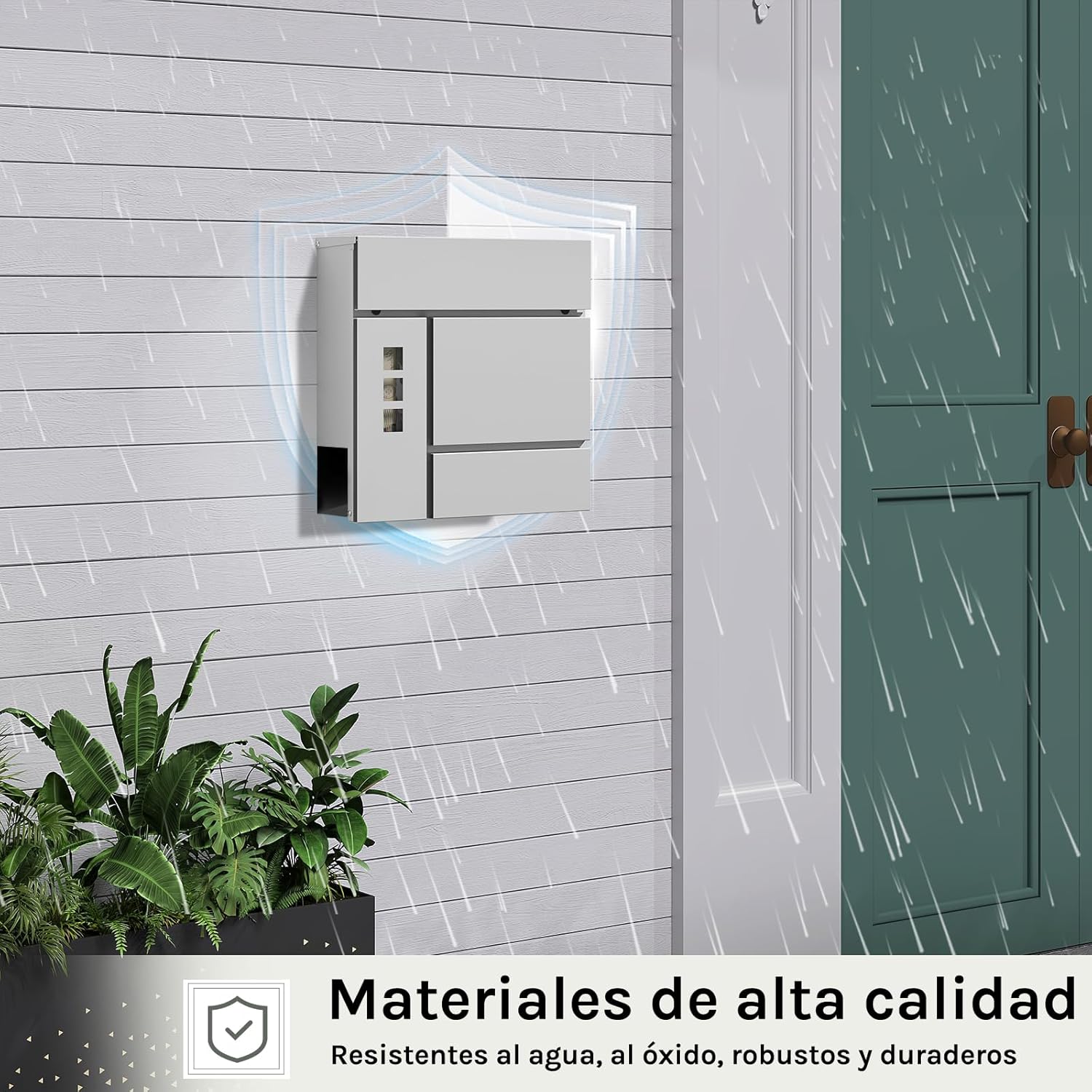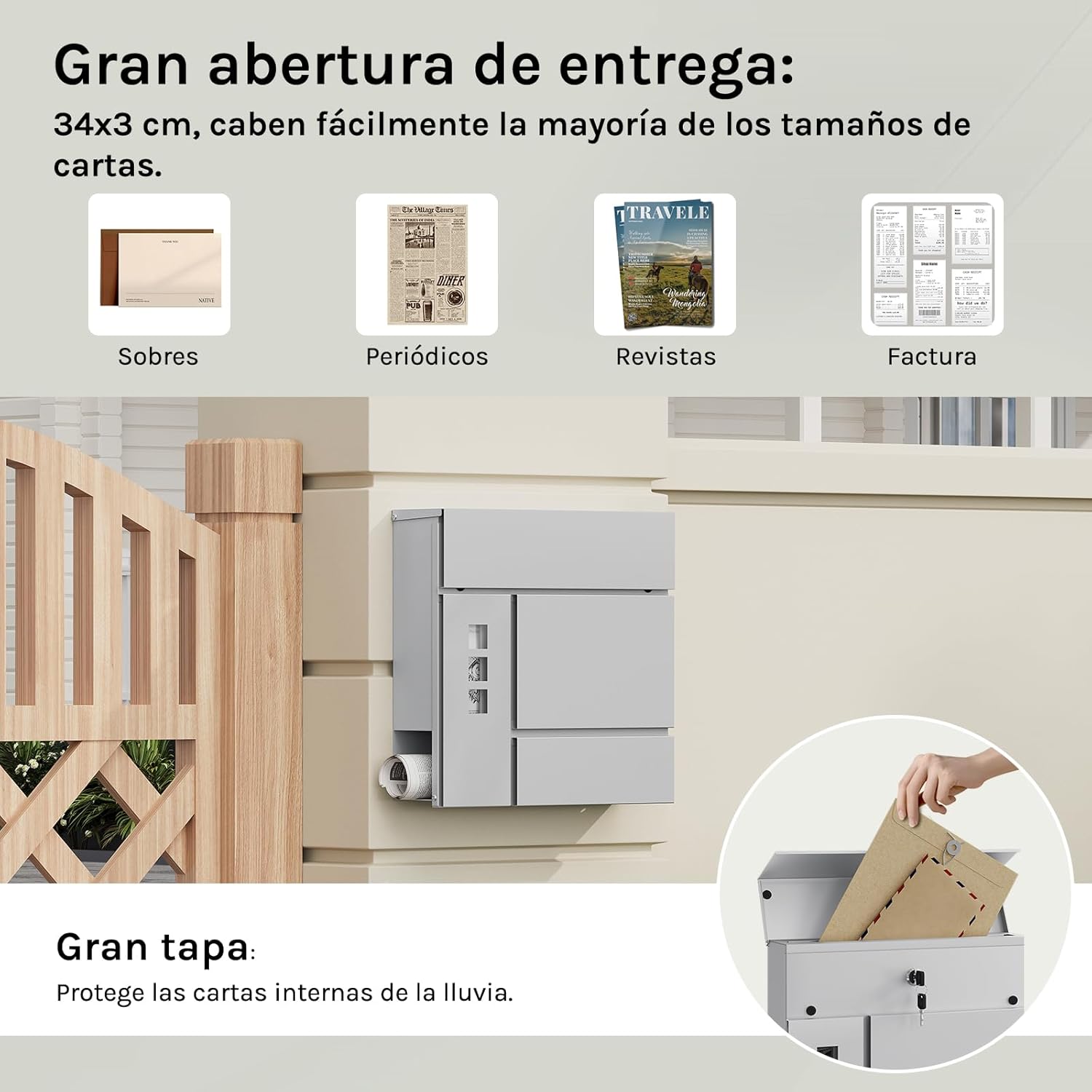 Apsauga nuo lietaus: įmetimo anga su užlenkiamu dangteliu apsaugo laiškus nuo lietaus ir nešvarumų, taip pat padeda išvengti spynos rūdijimo ir prailgina naudojimo laiką.
