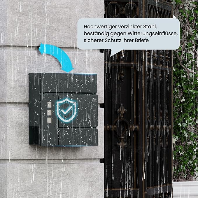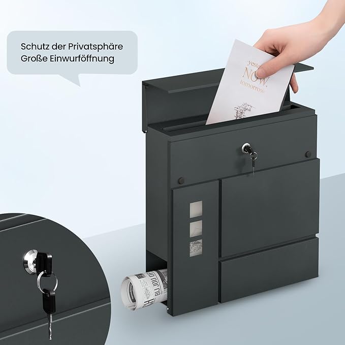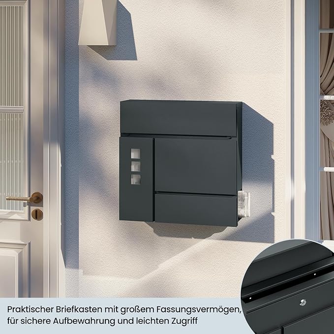 Rami ir elegantiška antracito spalva, derinama su geometriniu išdėstymu ir švariomis linijomis, suteikia pašto dėžutei išskirtinį vaizdą. Ji puikiai dera prie įvairių eksterjero stilių.