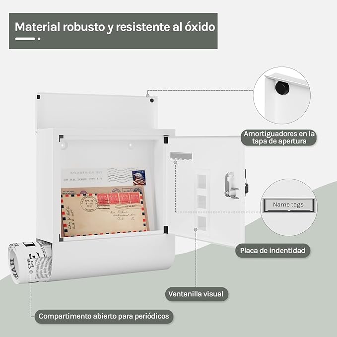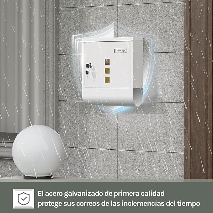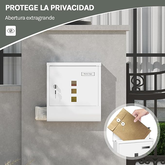 Aukšta kokybė ir modernumas: pašto dėžutė pagaminta iš cinkuoto plieno su danga – tvirta, nesideformuojanti, atspari vandeniui, nerūdijanti ir ilgaamžė. Paprastas ir elegantiškas baltas dizainas su aiškiomis linijomis suteikia modernų įvaizdį ir papuošia namų aplinką.