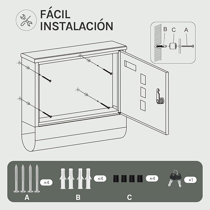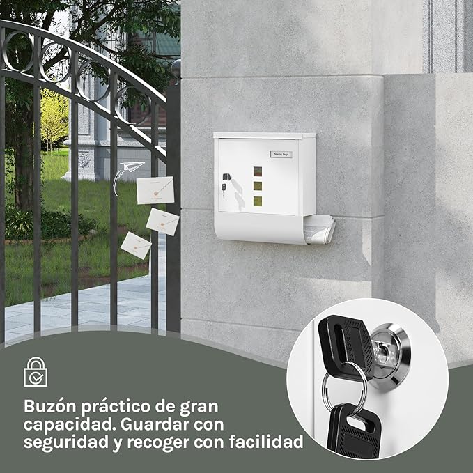 Spyna su 2 raktais: durelėse įmontuota aukštos kokybės spyna. Komplekte yra 2 raktai, todėl sieninę pašto dėžutę galima saugiai užrakinti.