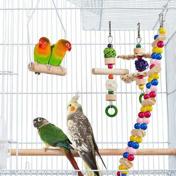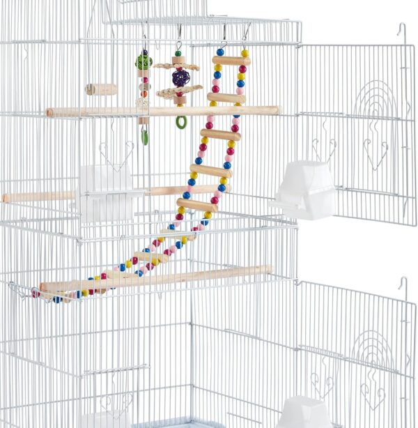 Žaidimų centras paukščiams: Bokštas komplektuojamas su 2 žaislais, kopėtėlėmis ir sūpuokle, kurią galima laisvai pakabinti didelėje narvo viduje. Taip narvas tampa ne tik namais, bet ir pramogų centru jūsų paukščiams.