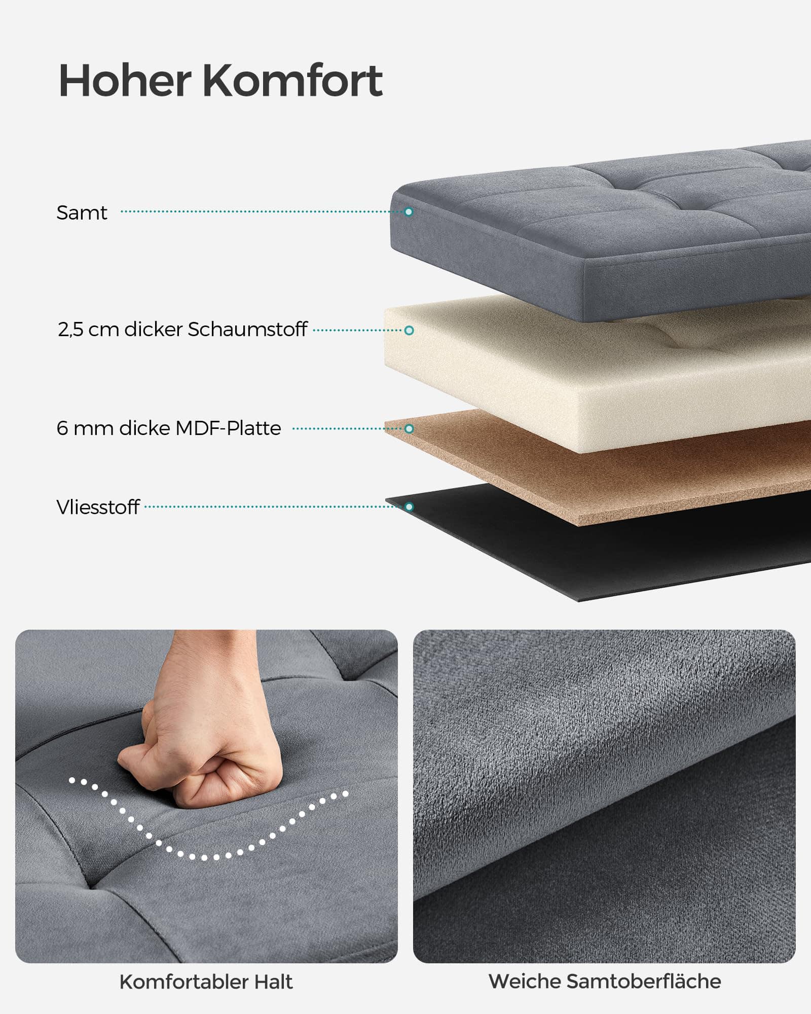 Elegant Design and High Seating Comfort: This stylish stool features a chic velvet surface with a quilted design, adding a touch of sophistication to your room. The double-layer fabric combined with highly elastic foam ensures lasting comfort for extended seating.