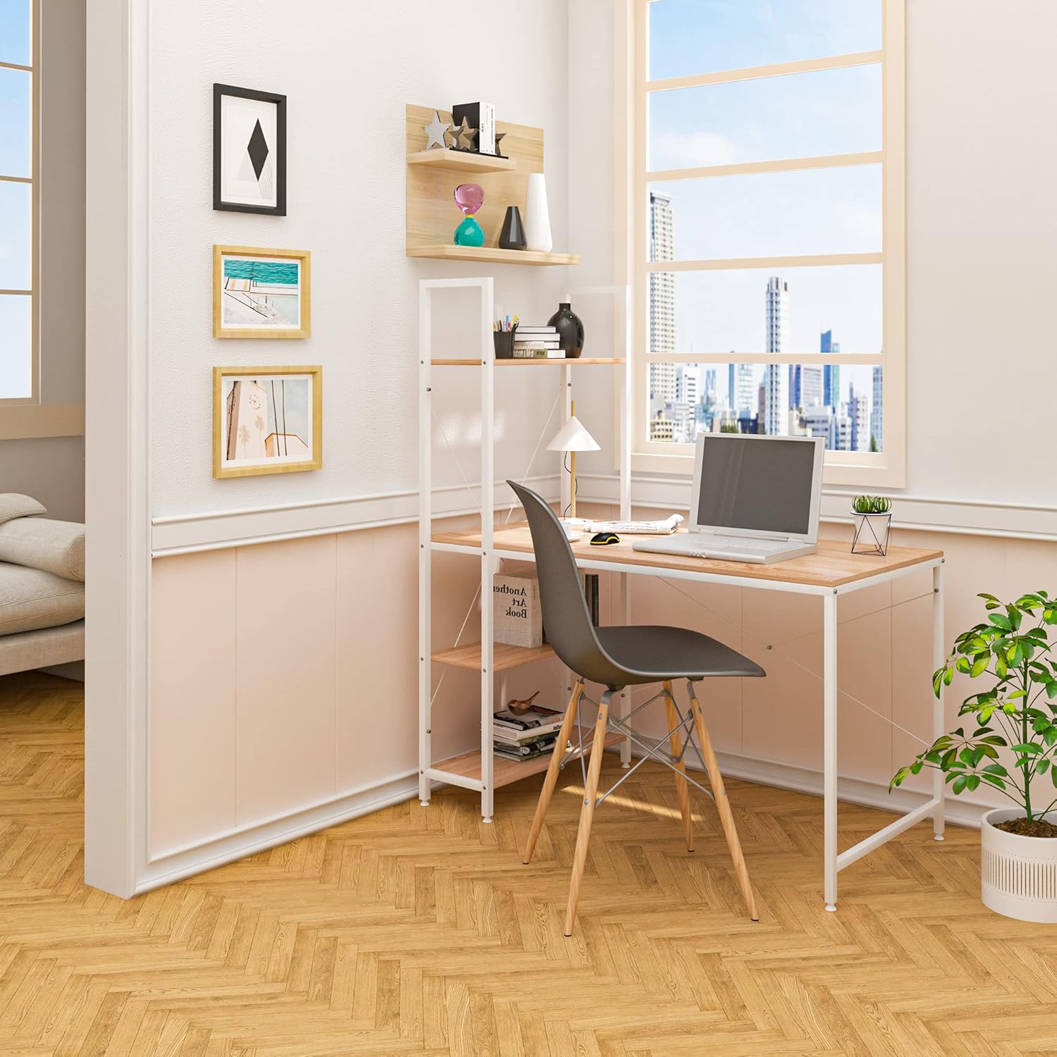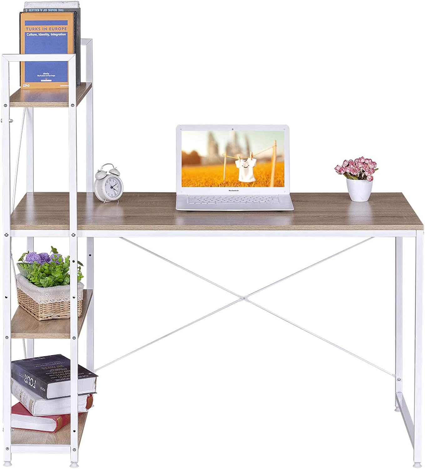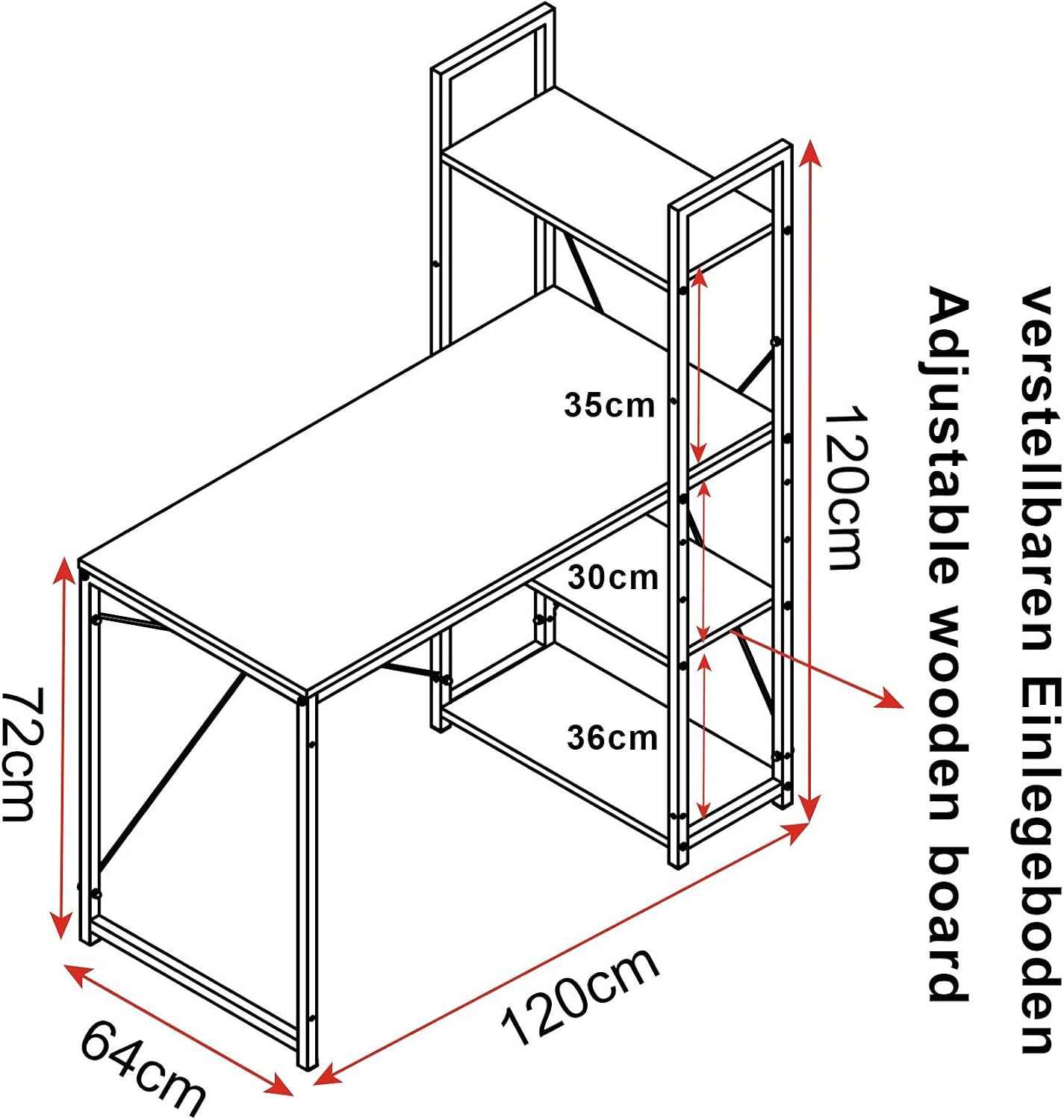 Didelė laikymo erdvė: platus stalviršis ir 3 lentynos suteikia daug vietos kompiuteriui, nuotraukų rėmeliams, dokumentams, knygoms, daiktų dėžėms ir kitiems reikmenims. Viską galėsite laikyti patogiai pasiekiamoje vietoje ir palaikyti tvarkingą darbo paviršių. Vidurinė lentyna po stalviršiu turi dvi aukščio pozicijas – ją pakėlus galima patogiai pastatyti kompiuterio bloką po stalu.