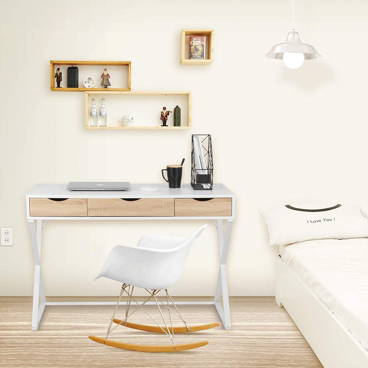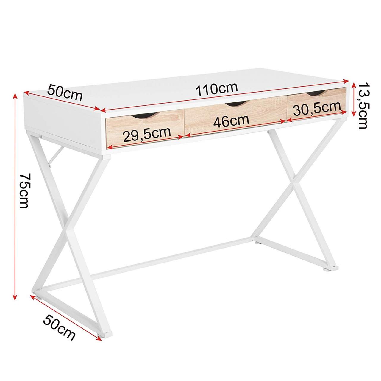 Aukštos kokybės medžiagos: šis rašomasis stalas su stalčiais pagamintas iš tvarių ir aplinkai draugiškų medžiagų. E1 klasės MDF plokštės padengtos melamino danga, todėl paviršius yra šlifuotas, atsparus įbrėžimams ir trinčiai, bekvapis bei lengvai valomas. Baltai dažytas plieninis rėmas yra tvirtas, kompaktiškas ir ilgaamžis.