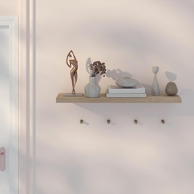 STILINGAS LAIKYMO SPRENDIMAS: Ši sieninė lentyna – puikus būdas sukurti atvirą laikymo erdvę. Ji ne tik praktiška, bet ir estetiška, suteikianti daugiau vietos daiktams, neužimant grindų ploto. Tai ypač patogu mažoms erdvėms, kur svarbu taupyti vietą, bet išlaikyti patogų daiktų pasiekiamumą.