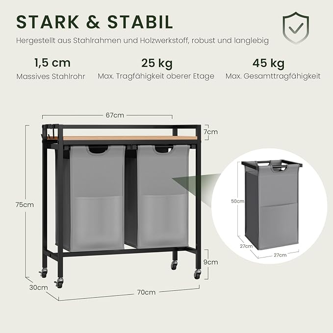 JUDRUS IR STABILUS DIZAINAS: Spintelė su skalbinių krepšiais turi 4 ratukus, iš kurių 2 – su stabdžiais. Tai leidžia lengvai perstumti baldą į bet kurią vietą ir tvirtai užfiksuoti reikiamoje padėtyje. Paaukštintos šoninės atramos užtikrina daiktų saugumą ir apsaugo nuo iškritimo. Aukštos kokybės guminiai ratukai nebraižo grindų ir sumažina triukšmą judant.