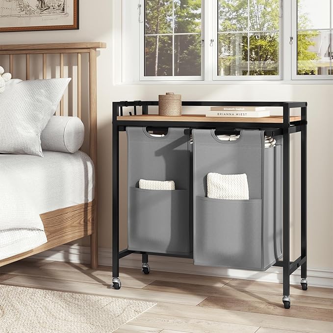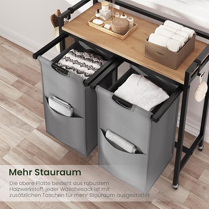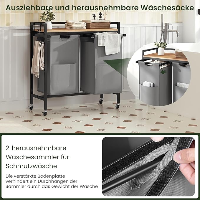 IŠIMAMI SKALBINIŲ MAIŠAI: Šis skalbinių krepšas turi 2 nuimamus maišus, todėl skalbinius galite lengvai rūšiuoti. Maišai pritvirtinti „Velcro“ lipdukais, todėl juos paprasta nuimti ir vėl pritvirtinti. Kiekvieno maišo talpa – 40 litrų, o sutvirtinta atraminė juosta apačioje apsaugo nuo maišo nusmukimo, kai jis pilnas.