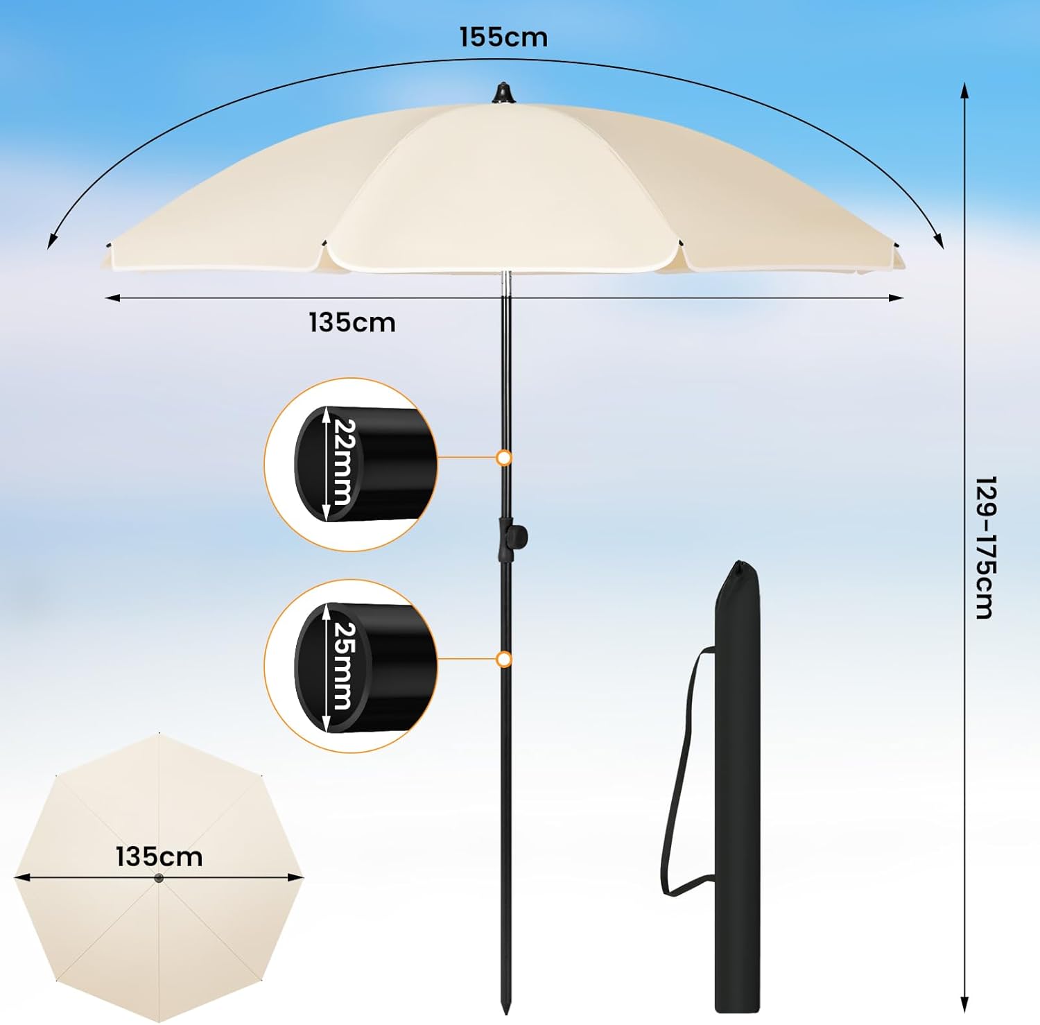 Montavimas be įrankių: skėtį labai paprasta pastatyti. Tereikia sujungti du stiebo segmentus varžtu ir įsmeigti smailų galą į žemę ar smėlį, todėl papildomas skėčio stovas nereikalingas.