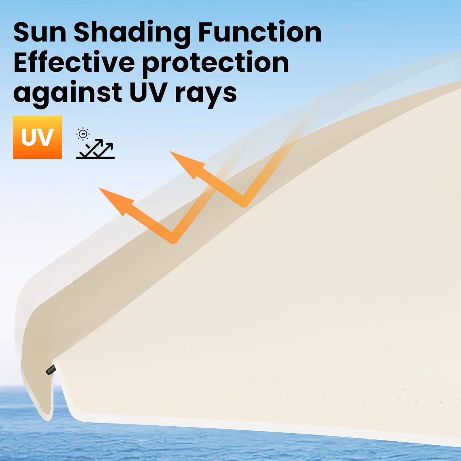 Apsauga nuo saulės: skėtis pagamintas iš 180 g/m² poliesterio su apsaugine danga. Medžiaga atspari UV spinduliams ir vandeniui, todėl efektyviai saugo nuo stiprios saulės ir leidžia patogiai mėgautis pavėsiu lauko veiklų metu.