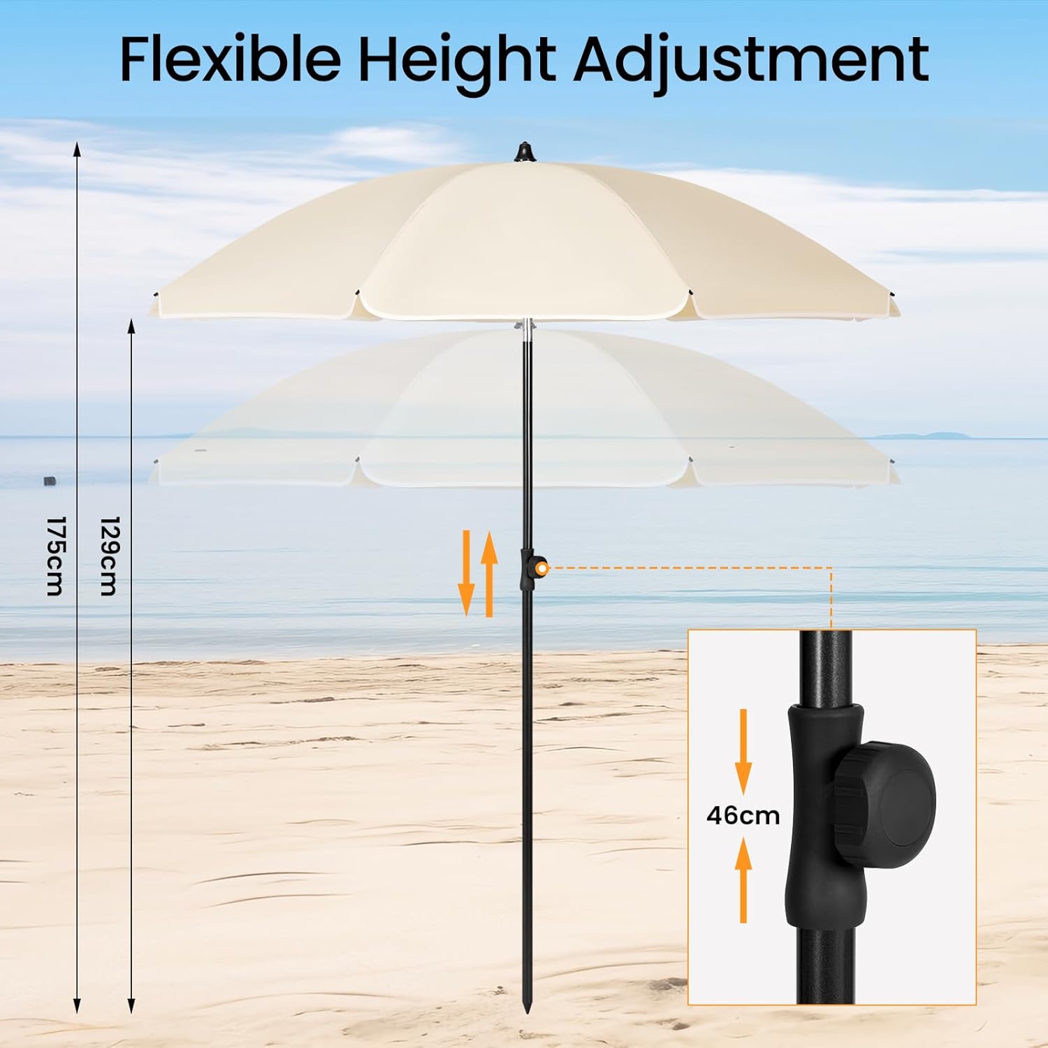 Reguliuojamas kampas ir aukštis: sodo skėtis turi tvirtą metalinį pasvirimo mechanizmą ir aukščio reguliavimo rankenėlę, leidžiančią lengvai nustatyti tinkamą kampą bei aukštį. Aukščio reguliavimo diapazonas – 129–175 cm, pasvirimo kampas – iki 45°.