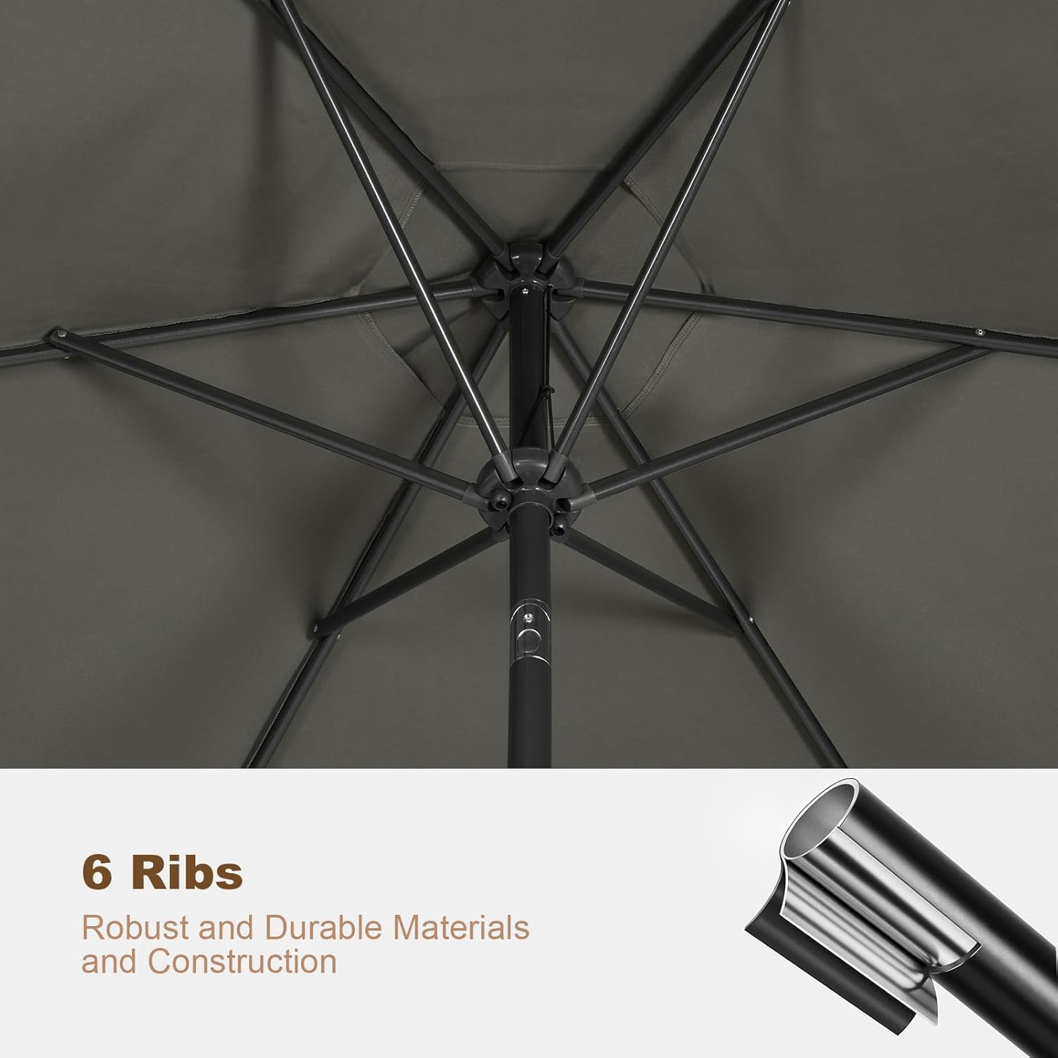 Tvirta ir patvari konstrukcija: sodo skėtis turi 6 metalinius stipinus ir 2 rūdims atsparius metalinius stiebus, todėl konstrukcija yra tvirta ir ilgaamžė. Viršuje esanti ventiliacijos anga sumažina vėjo poveikį ir padidina stabilumą.