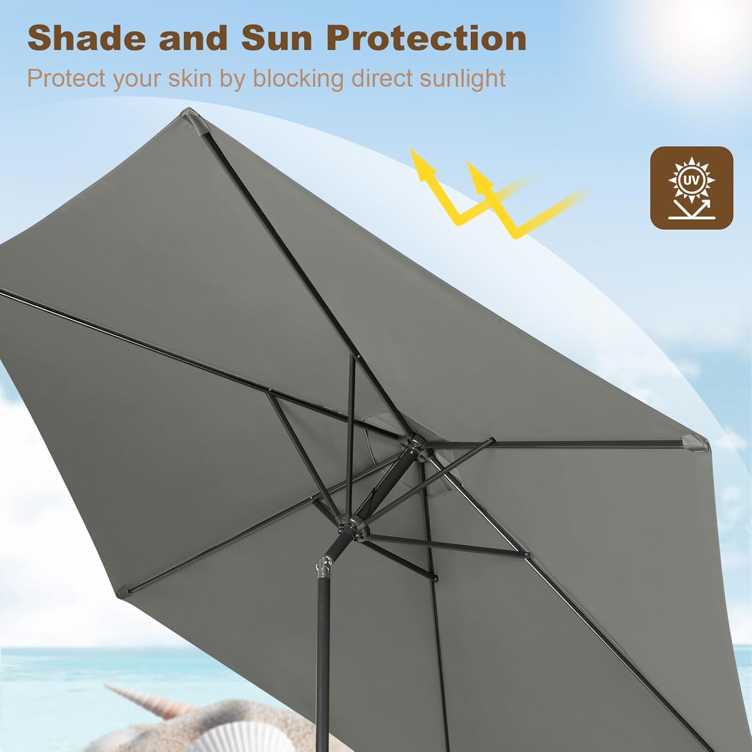 Lengvas pastatymas ir naudojimas: skėtį galima lengvai surinkti – tereikia sujungti viršutinę ir apatinę stiebo dalį naudojant spyruoklinį fiksatorių. Be to, dėl patogios rankinės rankenėlės skėtį galima greitai ir lengvai atidaryti bei uždaryti.