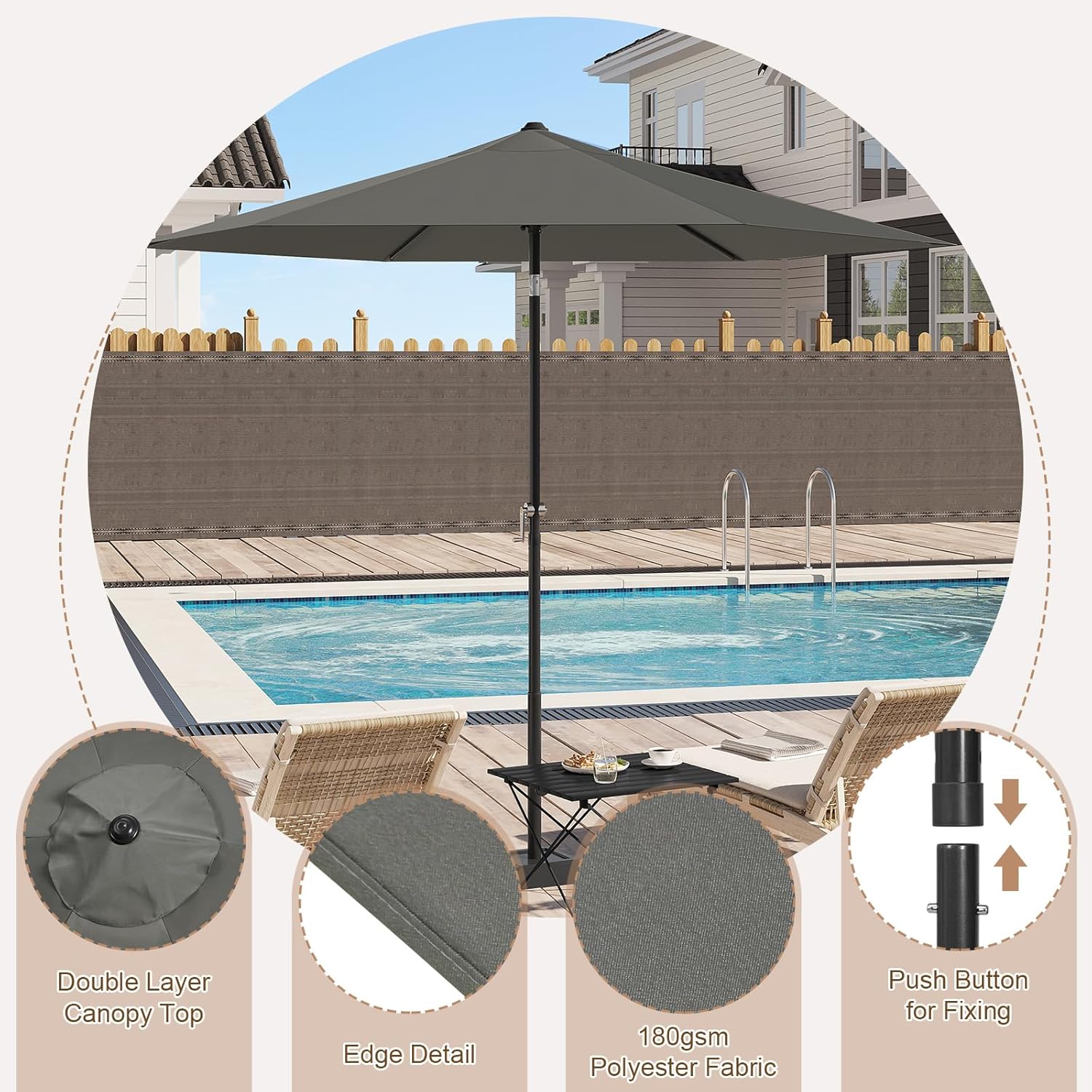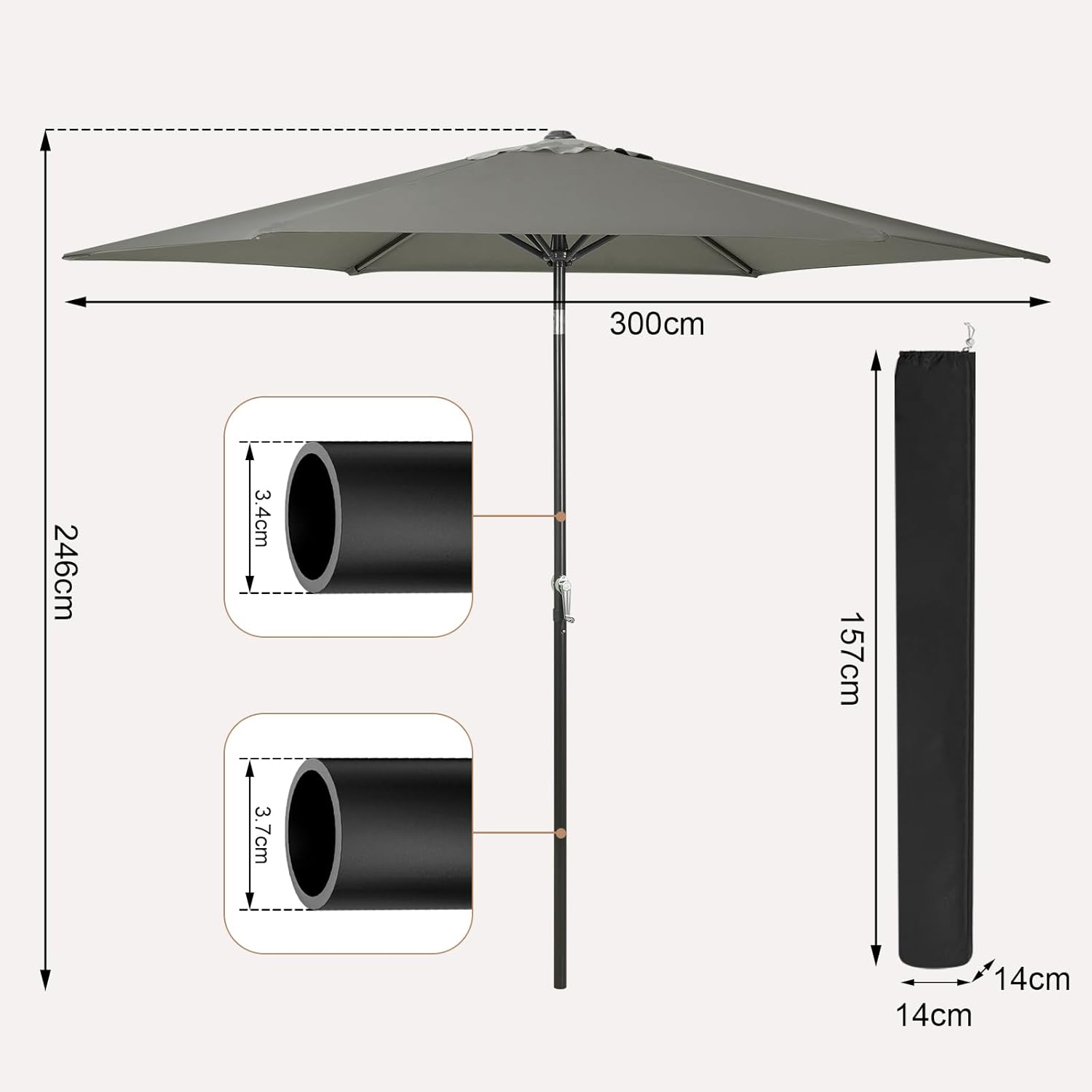 Apsauga nuo saulės: skėtis pagamintas iš 180 g/m² poliesterio audinio su apsaugine danga. Medžiaga atspari UV spinduliams ir vandeniui, o 300 cm skersmens kupolas užtikrina patikimą apsaugą nuo saulės ir lietaus lauko veiklų metu.