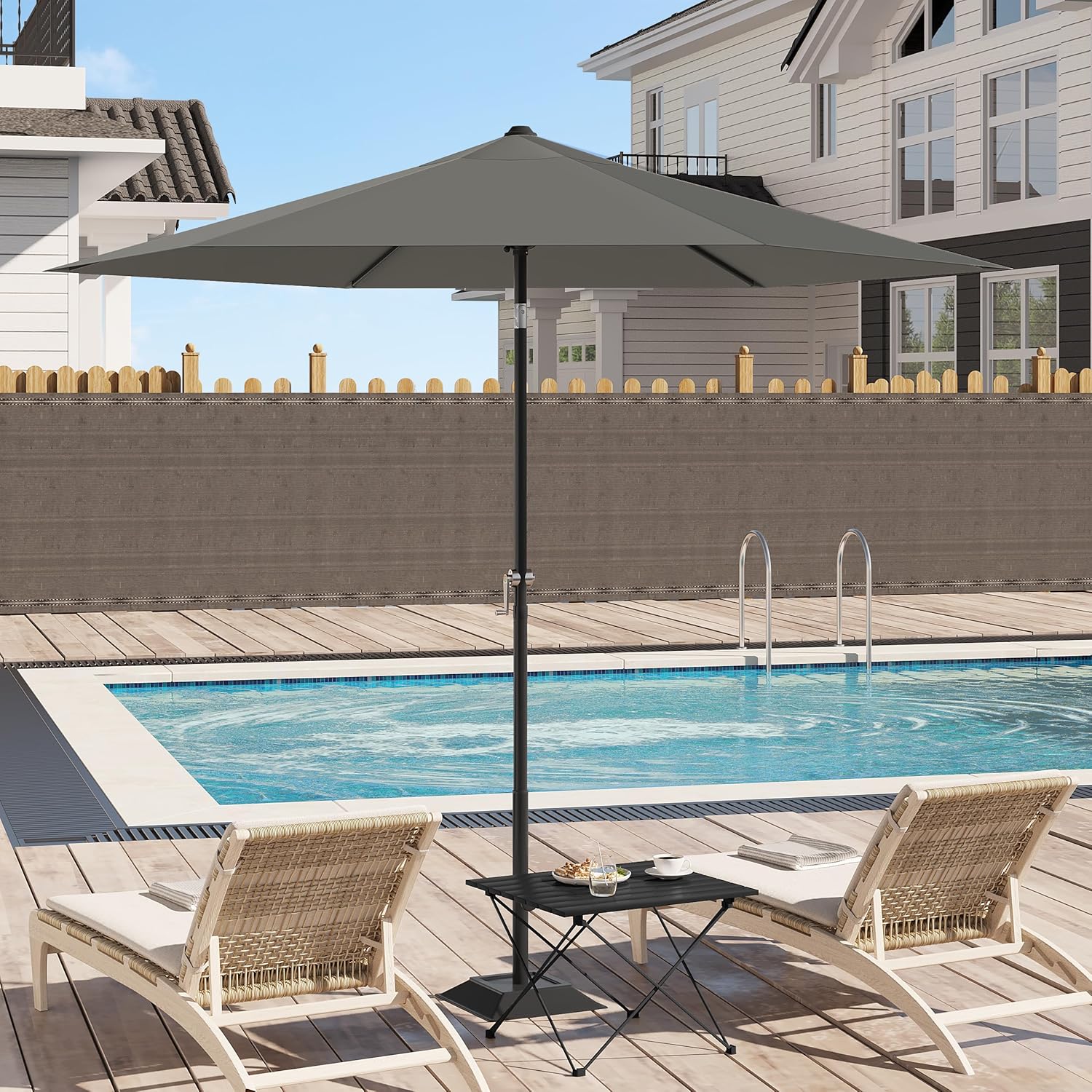 Reguliuojamas pasvirimas: balkono skėtis turi tvirtą metalinį pasvirimo mechanizmą, leidžiantį pakreipti kupolą iki 45°. Tai leidžia sukurti optimalų pavėsį nereikalaujant dažnai perstatyti skėčio ir padidina naudojimo patogumą.