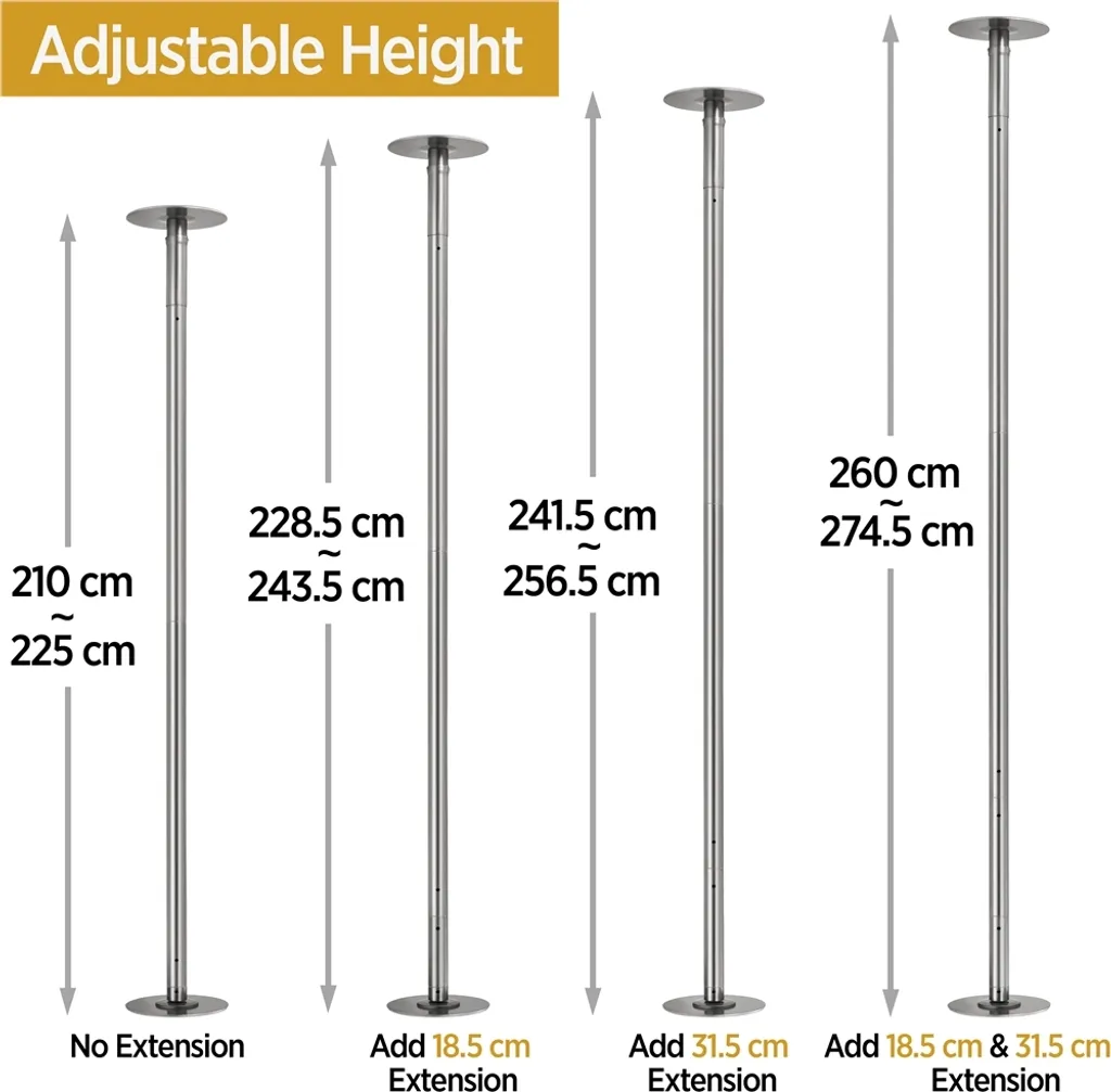 Reguliuojamas aukštis: Stulpą galima lengvai reguliuoti nuo 225 cm iki 274,5 cm. Dvi prailginimo dalys leidžia pritaikyti jį prie skirtingo aukščio lubų.