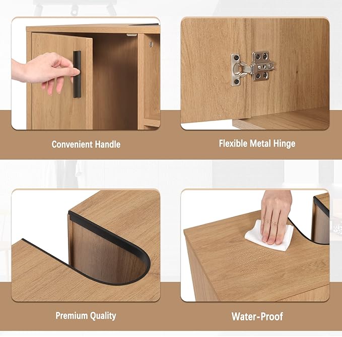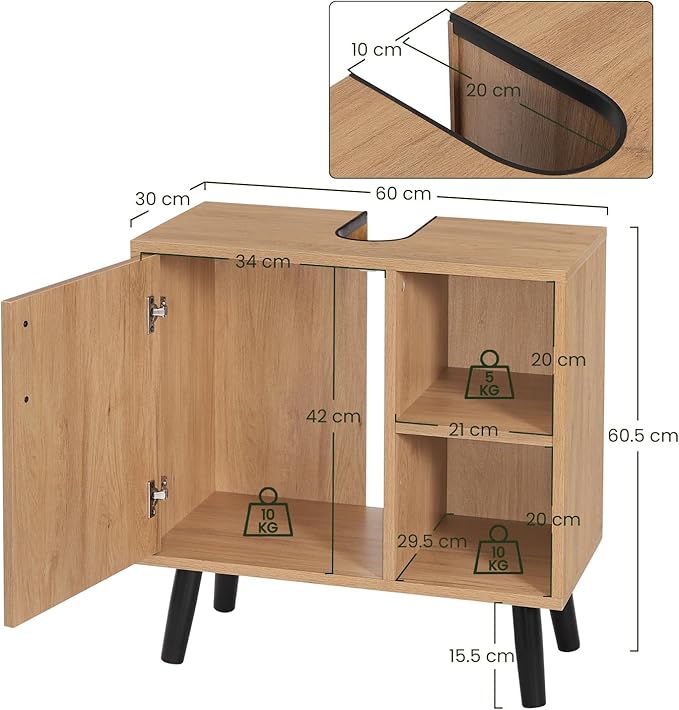 PATVARI IR ATSpari DRĖGMEI: Pagaminta iš E1 klasės medžio plokštės su pilnai užsandarintais kraštais, spintelė atspari drėgmei ir lengvai valoma. Metalinės kojelės suteikia stabilumo ir ilgaamžiškumo. Apkrovos riba: viršutinė ir apatinė lentyna – po 15 kg, atviros lentynos – po 10 kg.