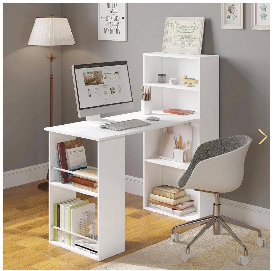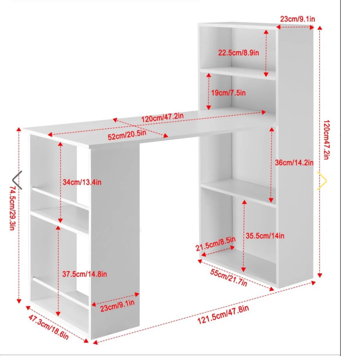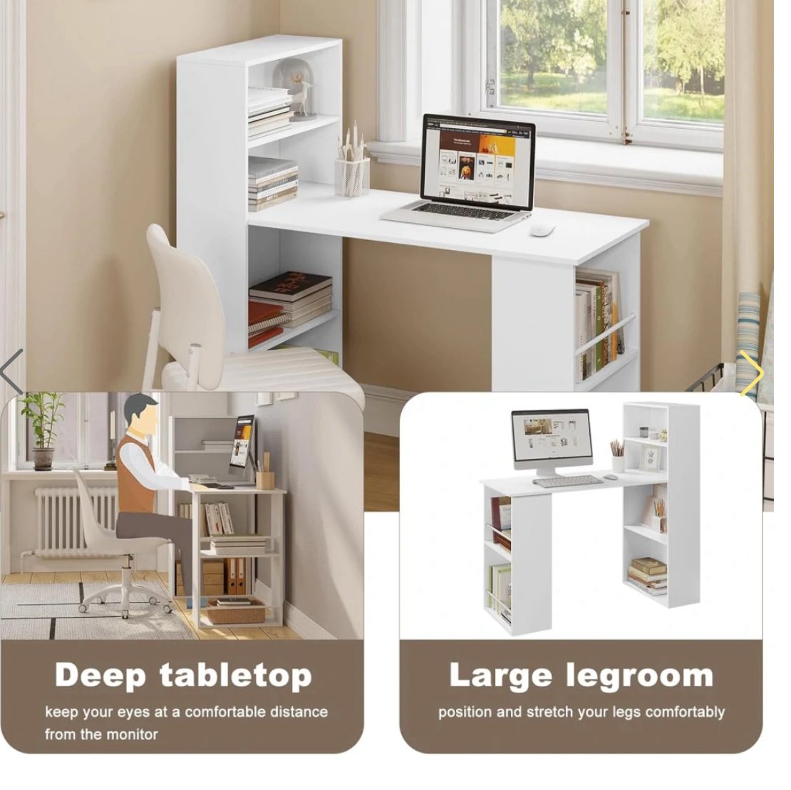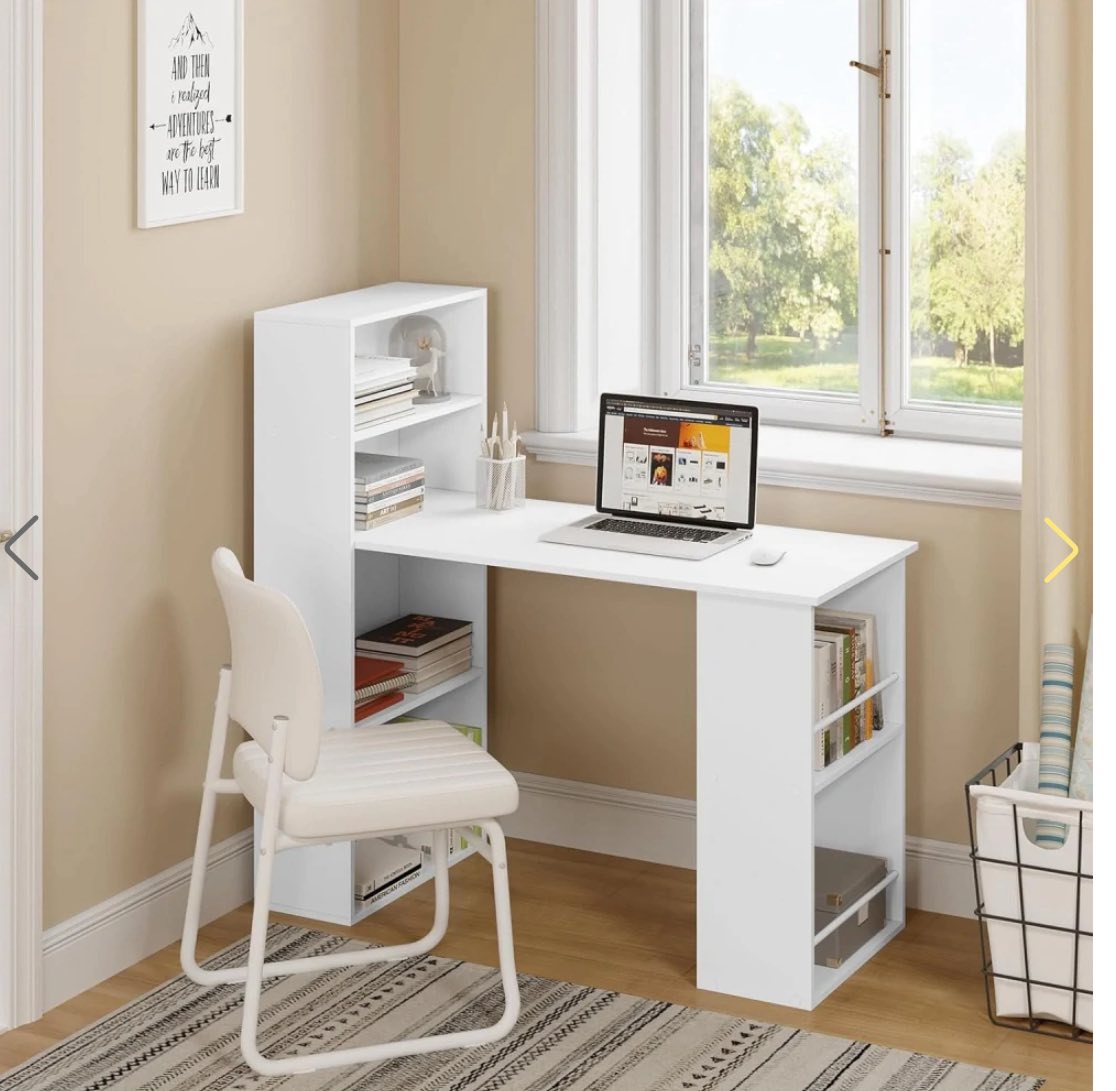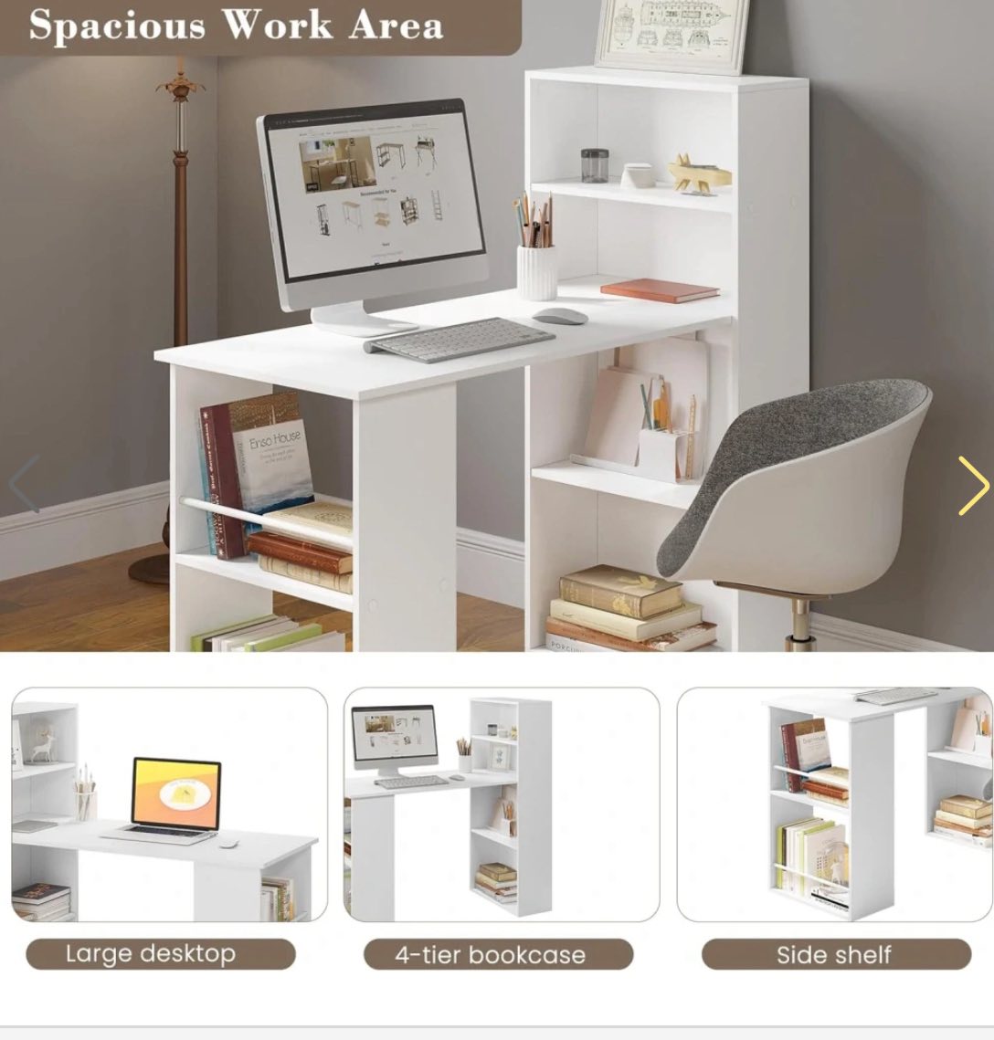 DAUG VIETOS DAIKTAMS LAIKYTI: Ant plataus kompiuterinio stalo paviršiaus galima patogiai įrengti darbo vietą su dviem monitoriais. Šoninė dviejų lygių lentyna ir keturių pakopų knygų lentyna suteikia pakankamai vietos biuro reikmenims, knygoms, dokumentams ar segtuvams laikyti.