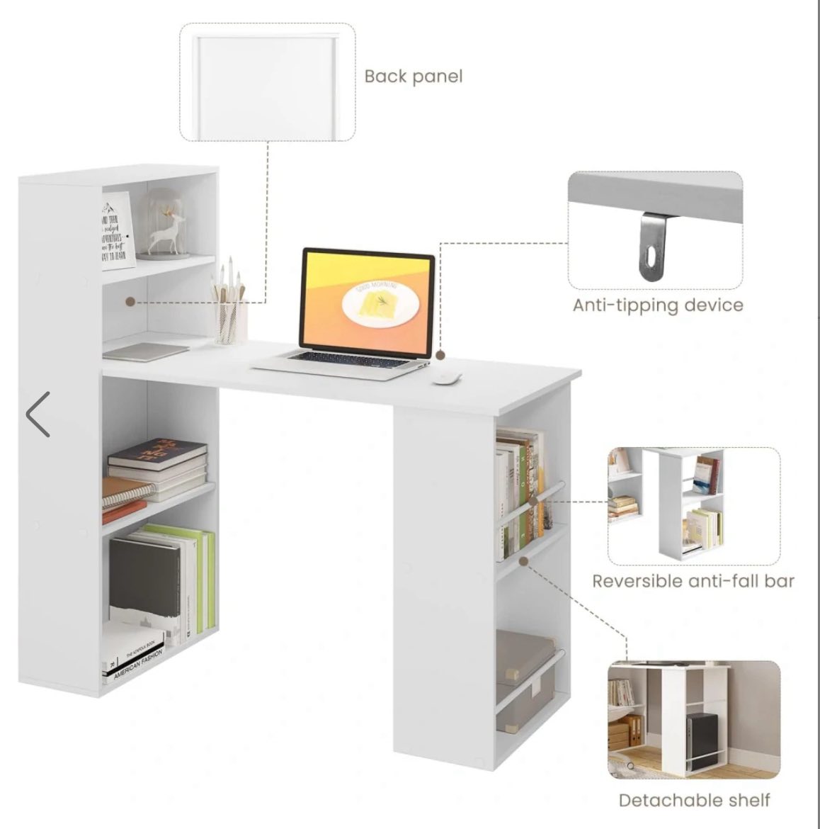 LANKSTUS MONTAVIMAS: Tinka tiek dešiniarankiams, tiek kairiarankiams. Knygų lentyną galima sumontuoti iš abiejų pusių. Nuėmus vidurinę lentyną, šoninė dalis tampa vieta kompiuteriui, o nuo kritimo apsaugančias plokšteles galima pritvirtinti bet kurioje pusėje.